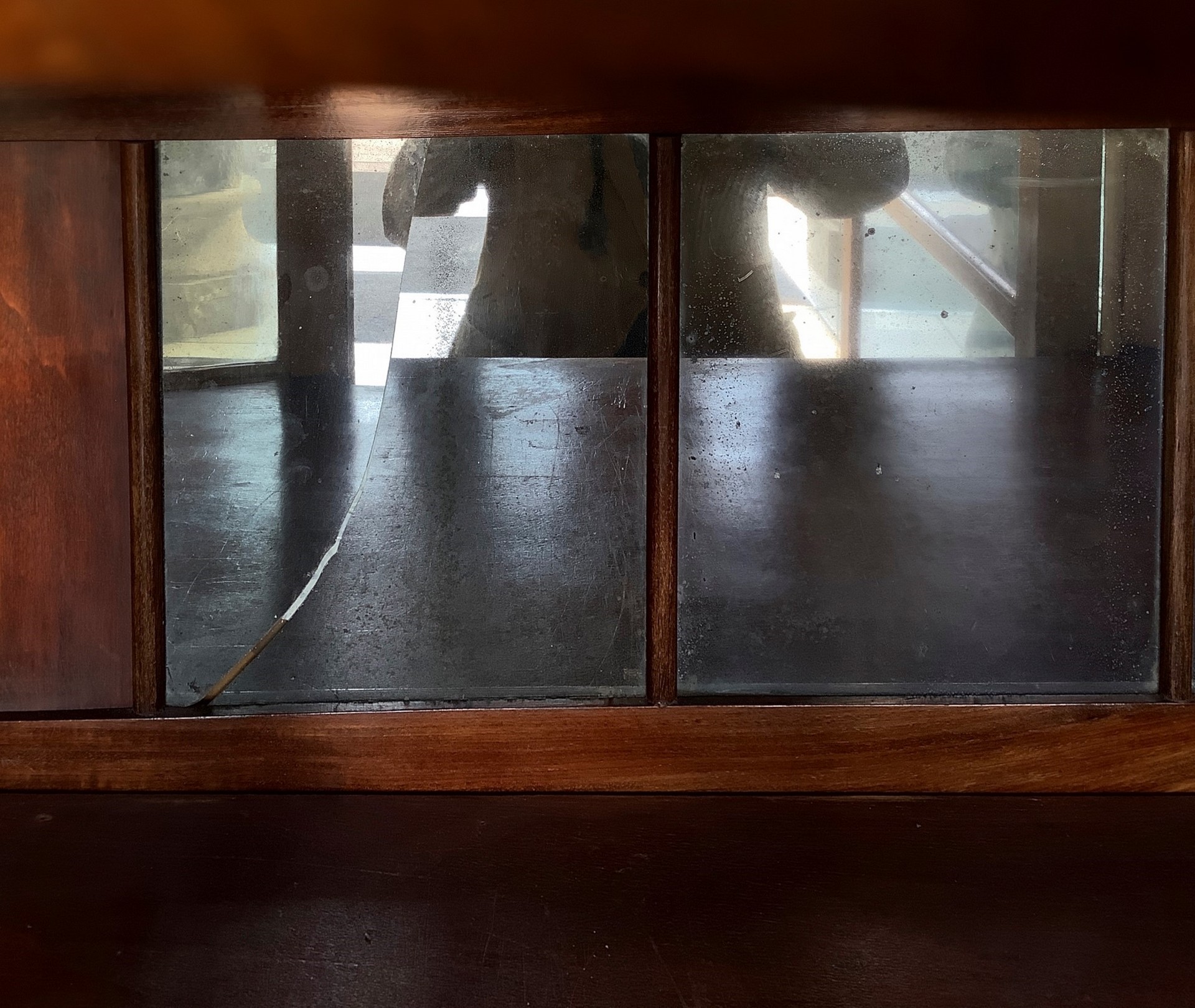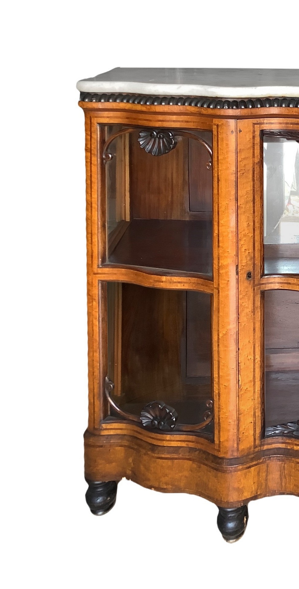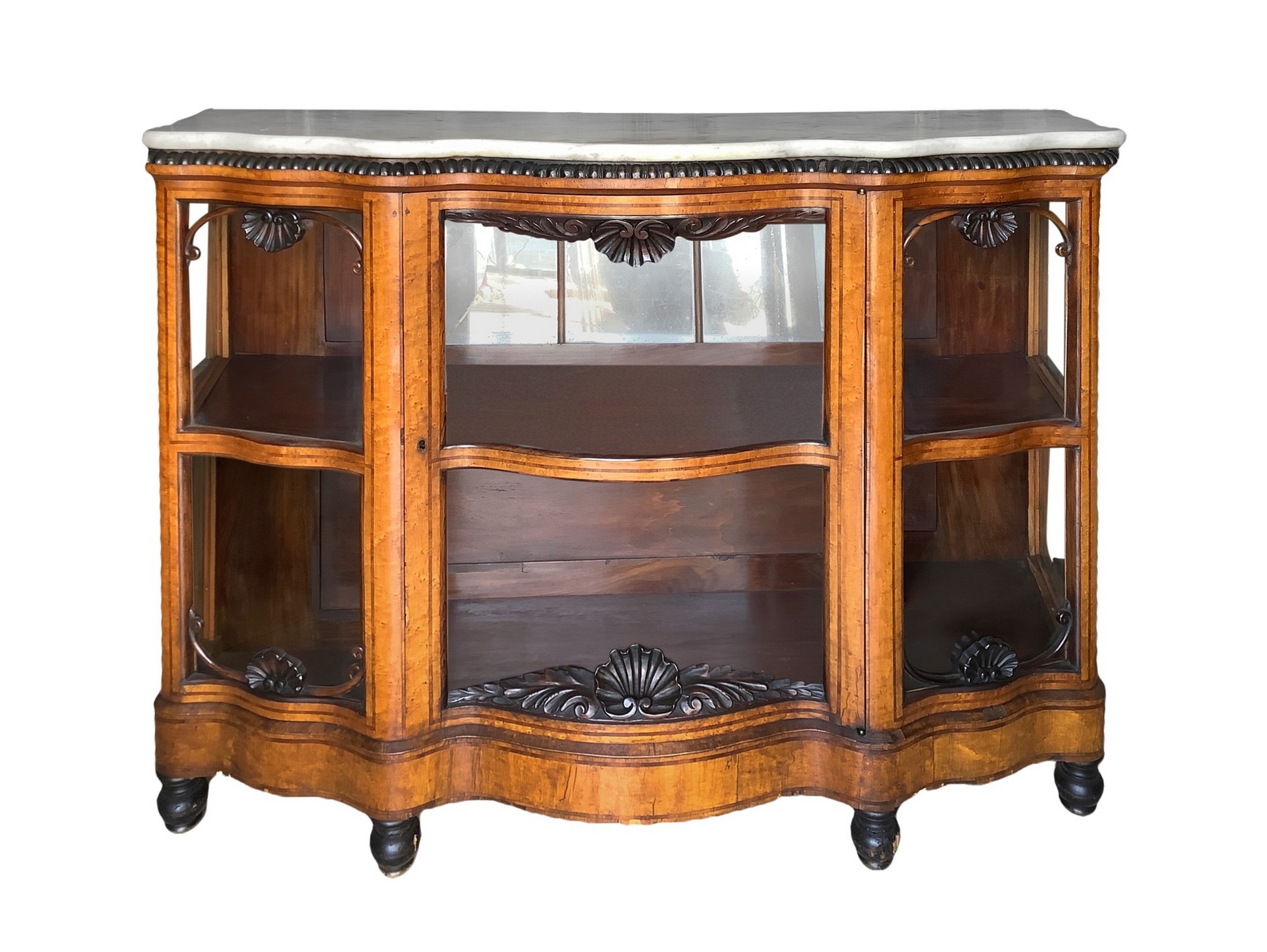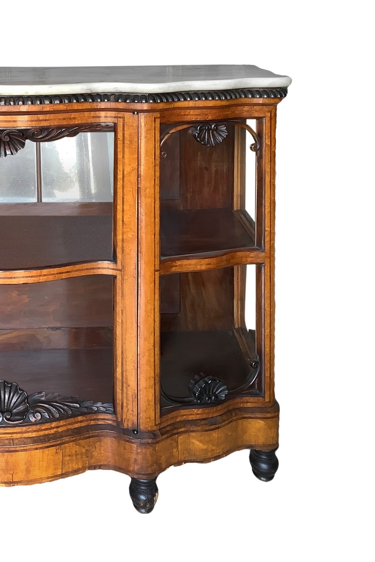 Etagere Carlo X a cristalli in legno d'acero e palissandro, Mid 19° secolo h 105 cm, l 151 cm, p 50 cm Vetri sul fronte e sui lati con applicazione di sculture a conchiglia intagliate e applicate.