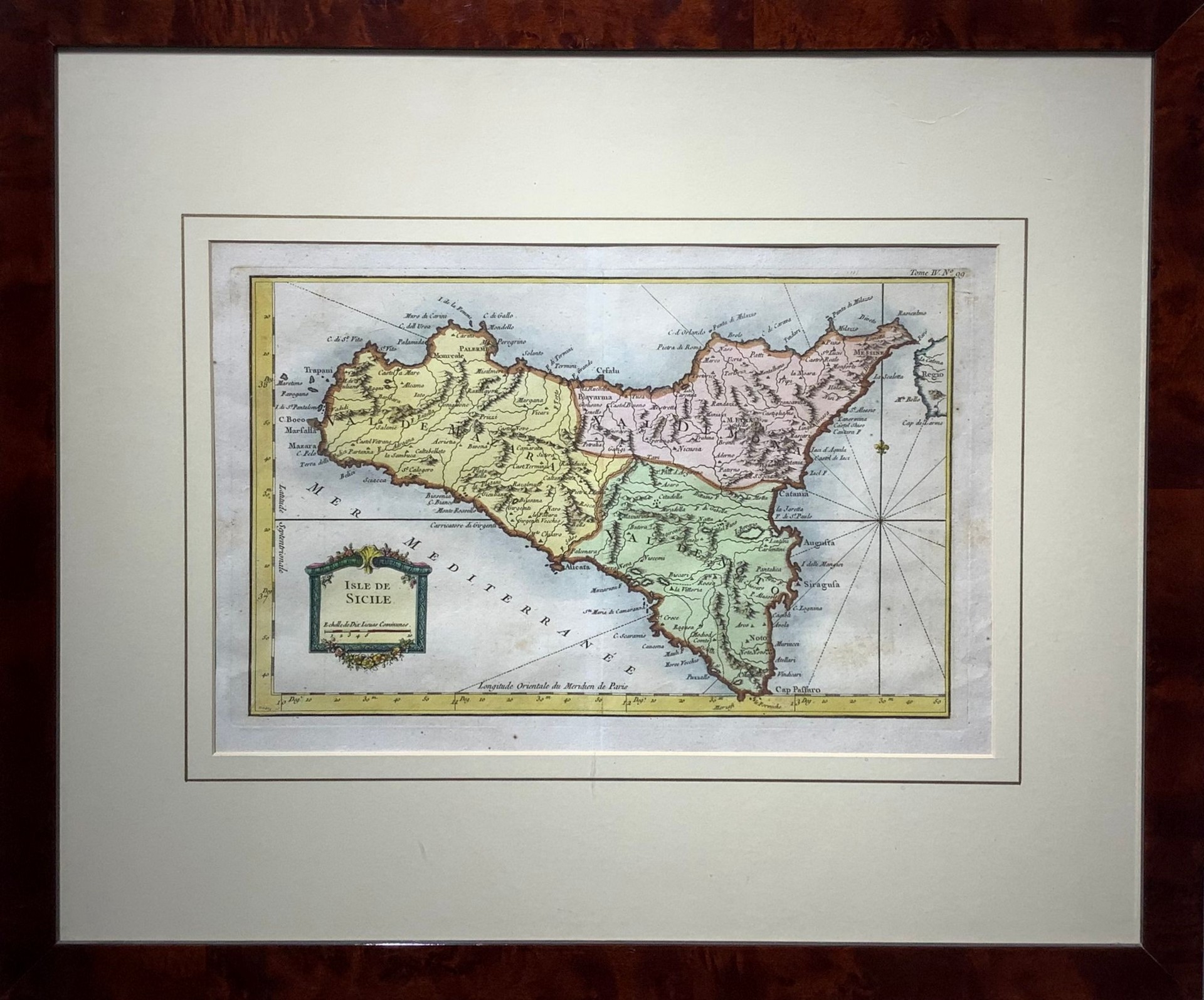 Jacques-Nicolas Bellin (Parigi 1703-Versailles 1772) - Isle de Sicilie, carta geografica, 1764 23,5 x 36,5 cm, in cornice 51x60 cm Incisione ad acquaforte su rame acquerellato Tratto da "Potit atlas maritime". In cornice radica e in ottime condizioni.