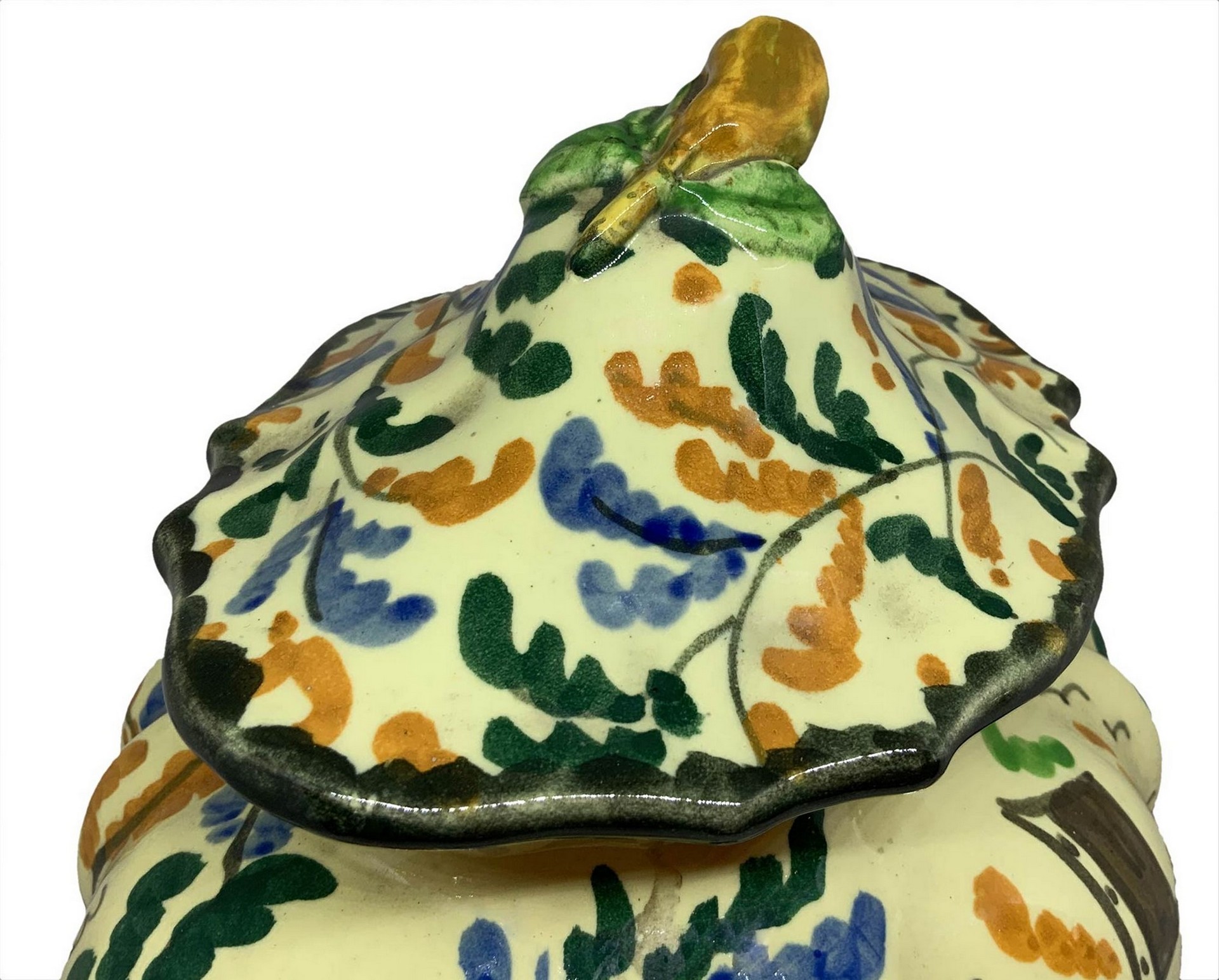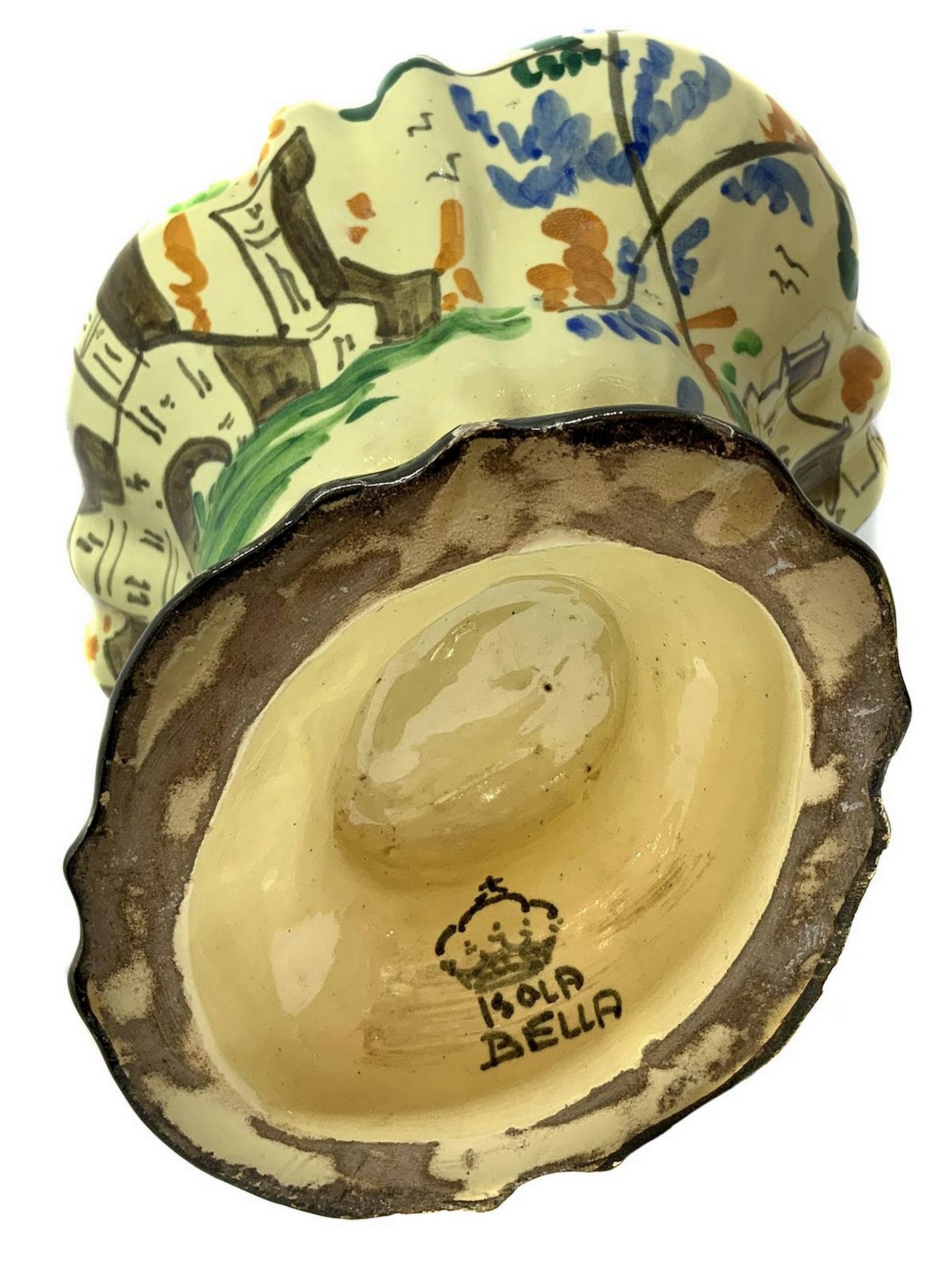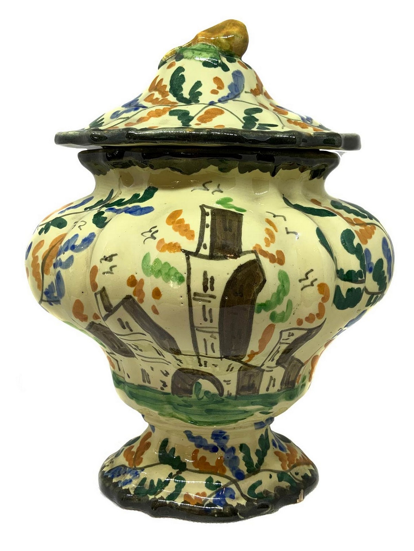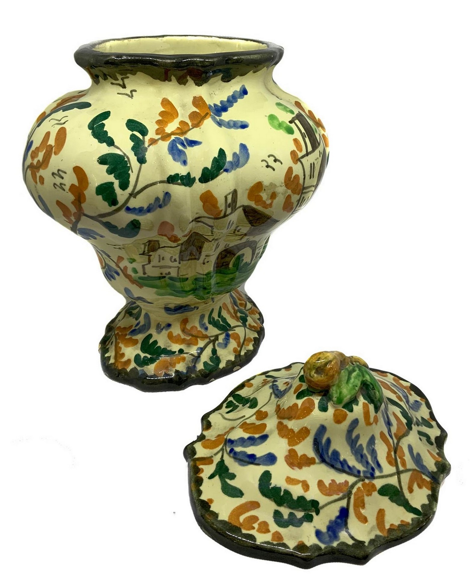 Torcisio Tosin (Cles 1904-Venezia 1999) - Raro vaso in maiolica a poutiche, Inizi 20° secolo H cm 27, base cm 13 Maiolica Coperchio con presa a pera. Fondo paglierino a ramage policromi, disegni di case. Marchio alla base con corona e scritta Isola Bella.
