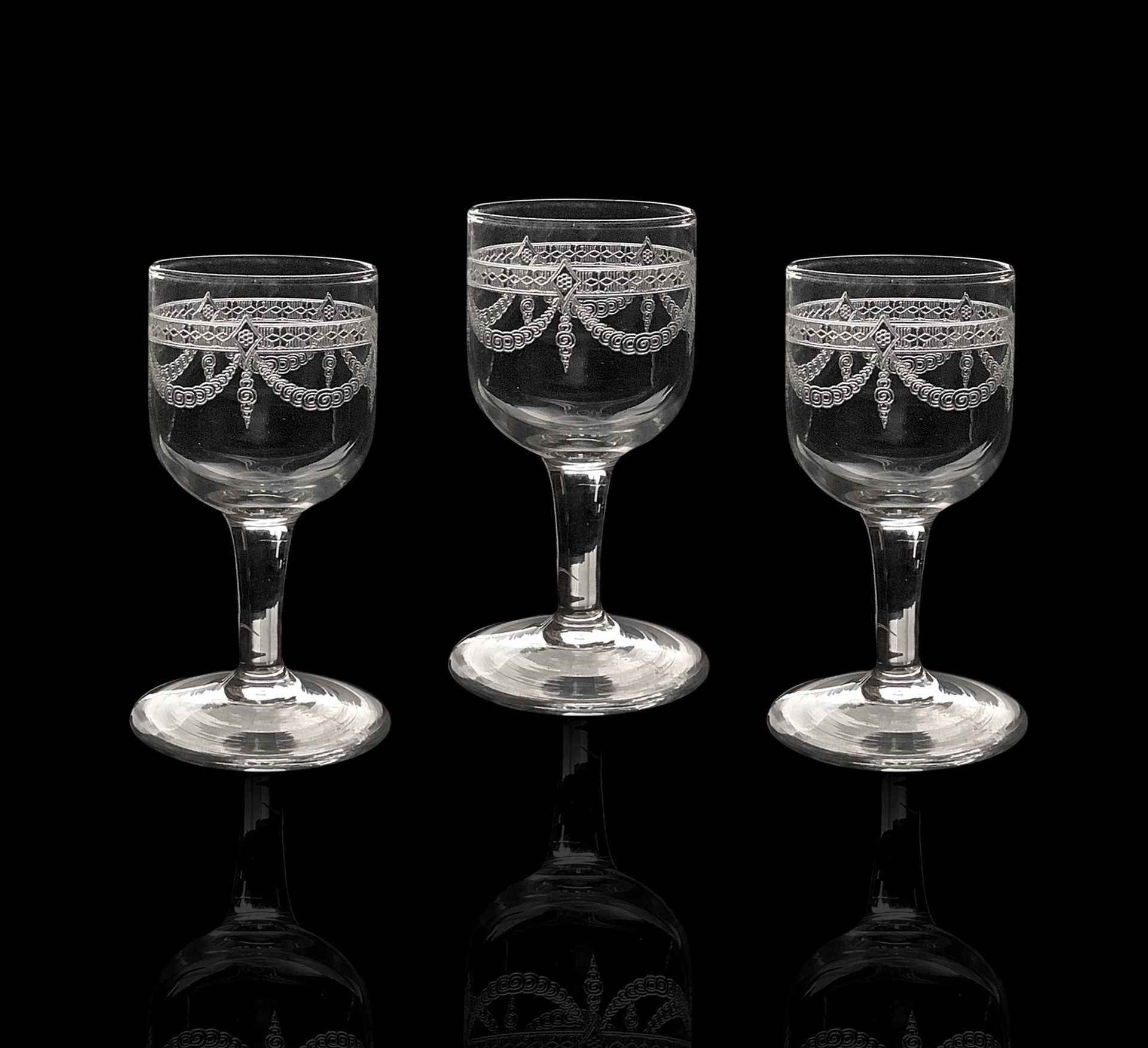 Servizio da 12 bicchierini in vetro da rosolio, incisi con decorazioni di ghirlande stile impero