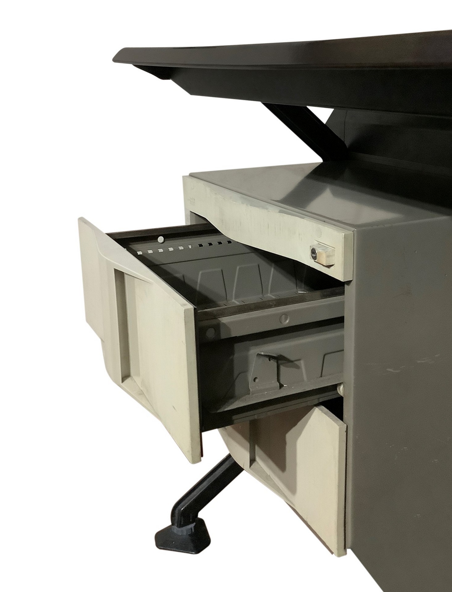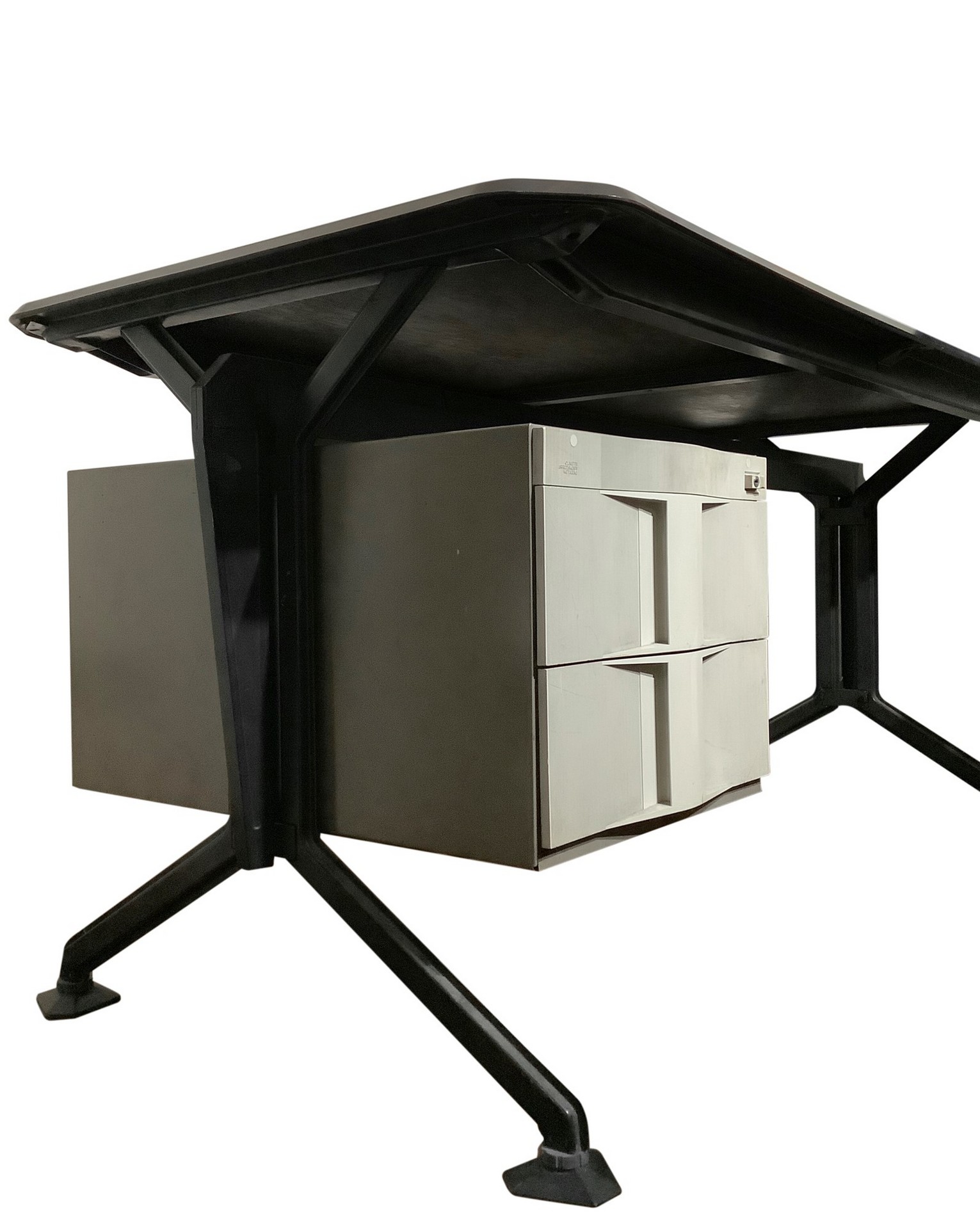 Disegno B.B.P.R Produzione Olivetti - Modello Syn°esis, scrivania in metallo laccato nei toni del nero h79 x piano 160 cm, p 79 cm Piano in formica, cassettiera due cassetti in mettalo e plastica. Segni d'uso.Piano in formica, cassettiera due cassetti in mettalo e plastica. Segni d'uso.