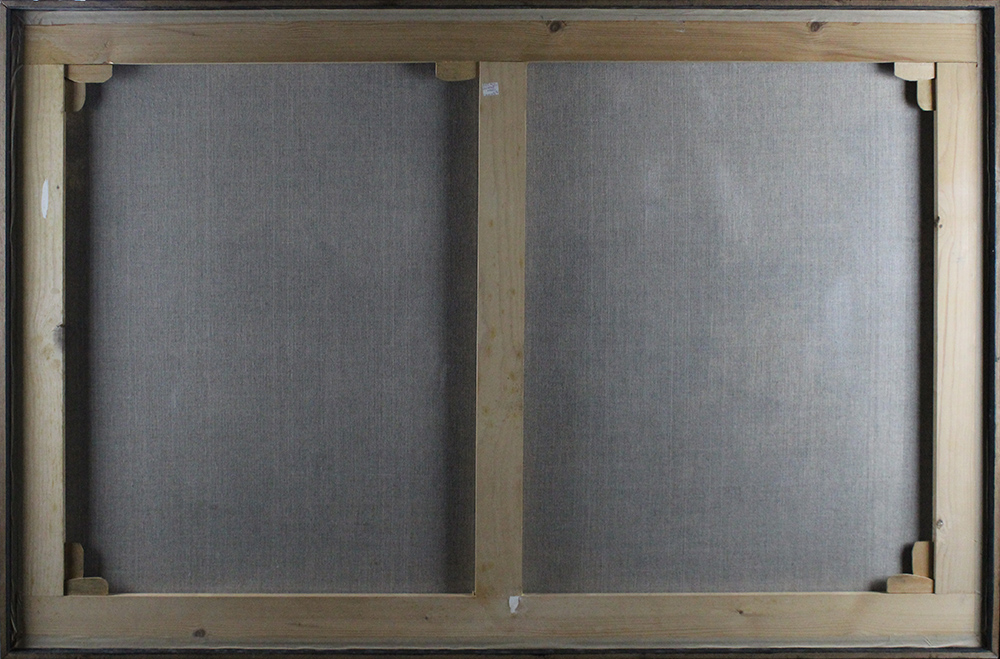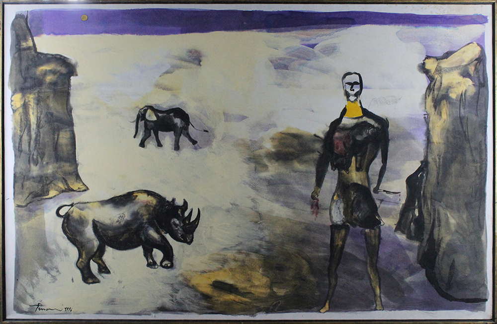 MARCO PERRONI, "Cacciatore d'avorio", 1996, Tecnica mista su carta intelata, Dim. 95,5x145,5, Al fronte: datata e firmata in basso a sinistra, Opera con cornice