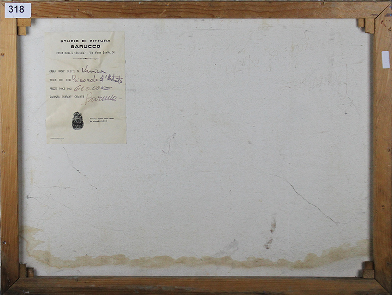 BARUCCO, "Ricordo d'estate", Olio su tela, Dim. 60x80, Al verso: certificato di garanzia di "Studio di pittura Barucco" Brescia firmato dall' Artista, Al fronte: firmato in basso a destra, Opera senza cornice