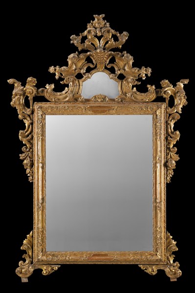 Specchiera in legno intagliato e dorato. Fregi a volute e fiori. Cimasa traforata centrata da cartella con specchio. Secolo XVIII (cm 122x164) (difetti e restauri)