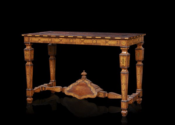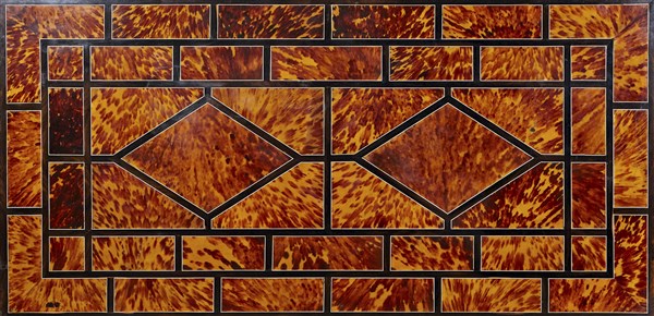 Tavolo da centro con piano a decoro geometrico lastronato in tartaruga, intarsiato in ebano e filettato in osso. Gambe rastremate, traversa tornita centrata da elemento architettonico. Secolo XIX (cm 126x80x62) (difetti)