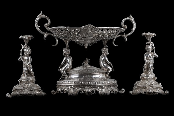 Trittico centrotavola in argento composto da alzata e due candelieri. Vasca biansata con fascia traforata decorata a mascheroni e rami fioriti, sorretta da due putti a tutto tondo con al centro dei volatili. Base ovale con volute fogliate e monogramma inciso. Candelieri a una fiamma con putti assisi che sorreggono una cornucopia. Secolo XIX. Apparentemente privo di punzoni (cm 48x68) (g 6600)