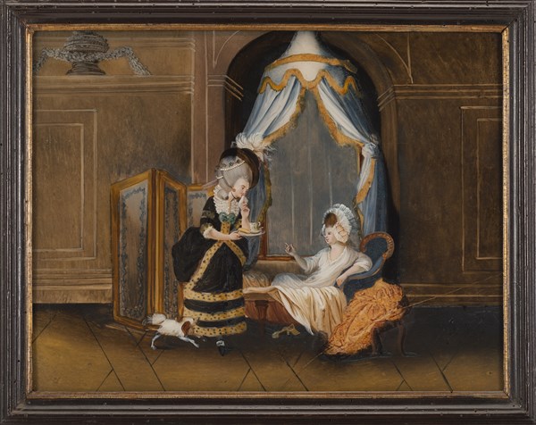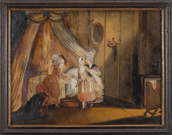 Scuola francese, secolo XVIII "Interni con figure femminili" coppia di verre-pe
