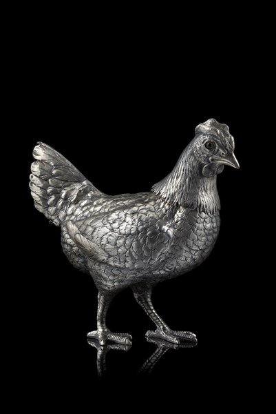 Gallina a tutto tondo in argento sbalzato con piume e zampe cesellate, occhi in