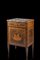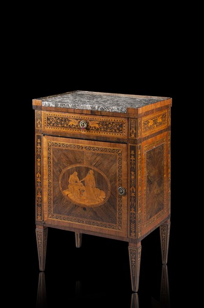 Late 18th-century Lombard inlaid in bois de rose, bois de violette and rosewood bedside commode. Facade decorated with Jupiter and Juno. Grey marble top (cm 59x88x46) (defects and restorations)