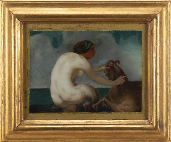 School of the 17th century "Nereid on sea monster" and "Satyress" pair of verre-peints (cm 12x14,5) In gilded frames (minor defects)