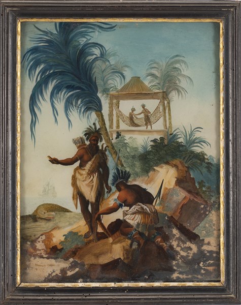 School of the 18th century "Allegory of Africa" and "Allegory of America" pair of verre-peints (cm 26x20) In lacquered and gilded wooden frames (defects)