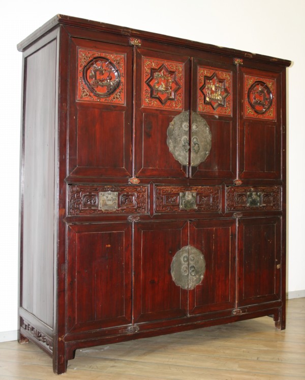 Firmato, datato. Armadio in legno con decorazioni a intagli, lacca e dorature. Cina. XIX secolo. Mis. Lung. cm. 160 Alt. cm. 166 Prof. cm. 65 ca.