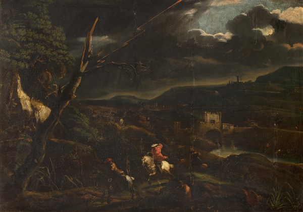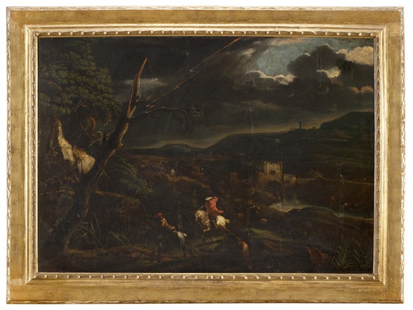 Gaspard Dughet (Roma 1615-1675) (attr.) Paesaggio con cavalieri Olio su tela,