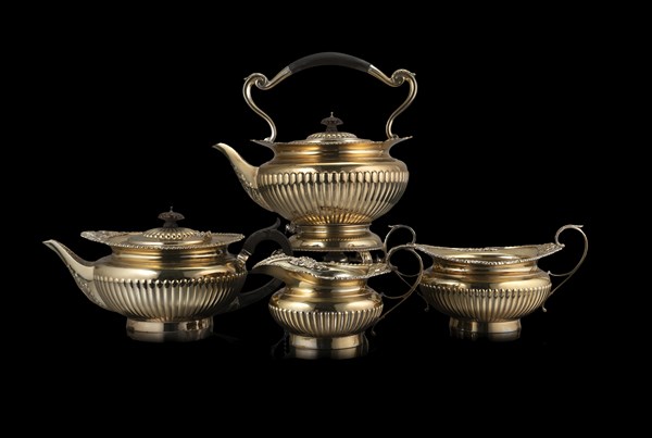 Part of a gilt silver tea and coffee service consisting of a samovar, teapot, milk jug and sugar bowl. London, 1912. Silversmith The Goldmisth & Silversmith Campany (cm 24x10) (g gross 3200) (defects)