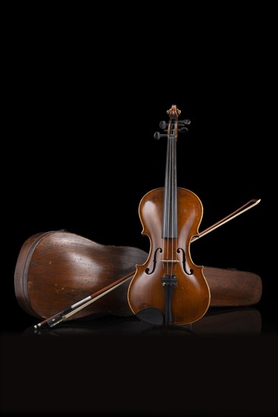 Modello Stainer, fondo in due pezzi con marezzatura leggera ed irregolare, vernice di colore marrone dorato, in discrete condizioni, etichetta «Jacobus Stainer in Absam / prope Oenipontum 1654», marchiato nella parte superiore del fondo «STAINER» (lunghezza del fondo mm 354). Con una custodia sagomata in legno ed un arco