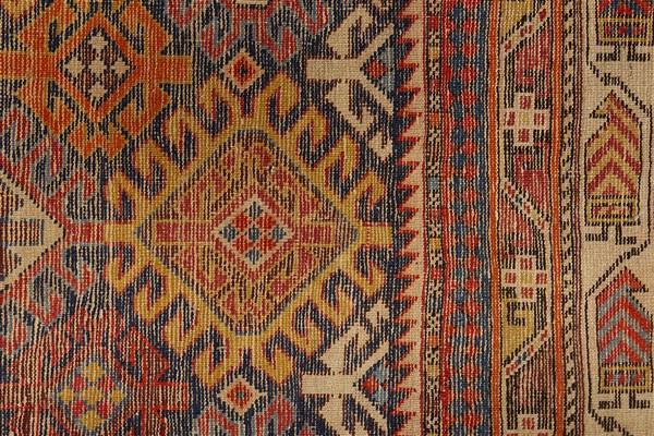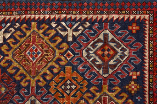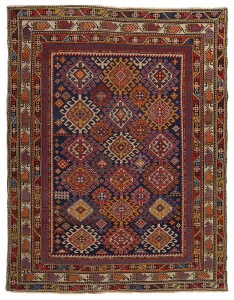 Tappeto Schirwan, Caucaso, fine secolo XIX. Decoro all over con tre file di piccoli medaglioni uncinati che ricordano i Memling Gül in policromia, su fondo blu notte. Bordura interna Medacyl. Bordura principale a fondo bianco con Boteh legati a meandro (cm 148x119) (difetti, rapature e minimi vecchi restauri)