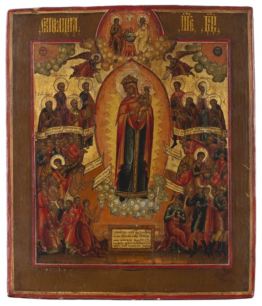 Arte russa del secolo XIX "Madonna Gioia degli afflitti" icona ad olio su tavol