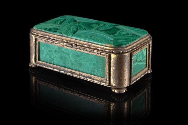 Scatola rivestita in malachite e argento dorato, profili e ghiera cordonati, piedi a sfera. Titolo 800 (cm 10x4x6) (difetti e rotture)