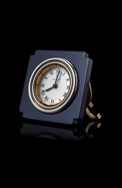 CARTIER Orologio da comodino di forma quadrata in ottone e lacca. Quadrante a c