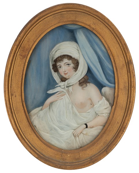 Scuola francese, secolo XIX "Ritratto di dama con copricapo" verre-peint ovale