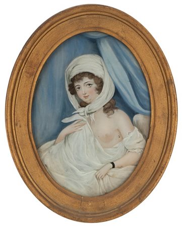 Scuola francese, secolo XIX "Ritratto di dama con copricapo" verre-peint ovale (cm 18,5x14) In cornice in legno dorato (difetti)