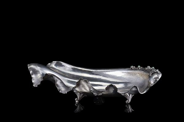 Centrotavola in argento sbalzato e inciso a forma di conchiglia, poggiante su t