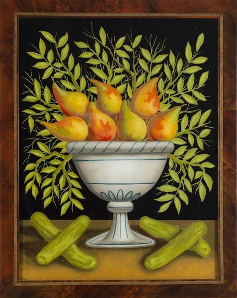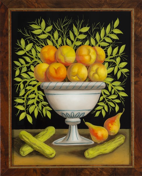 Unknown artist, 20th century "Vases with fruits and vegetables" two verre-peints (cm 64,5x51; cm 66x50) In inlaid and veneered wooden frames (minor defects)