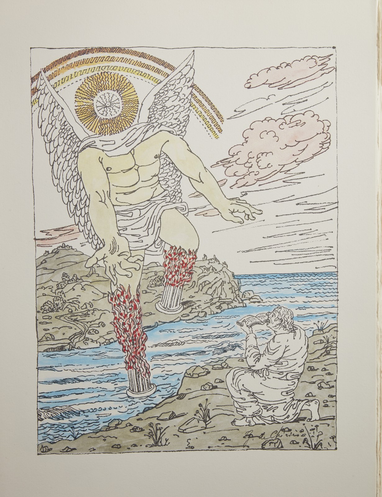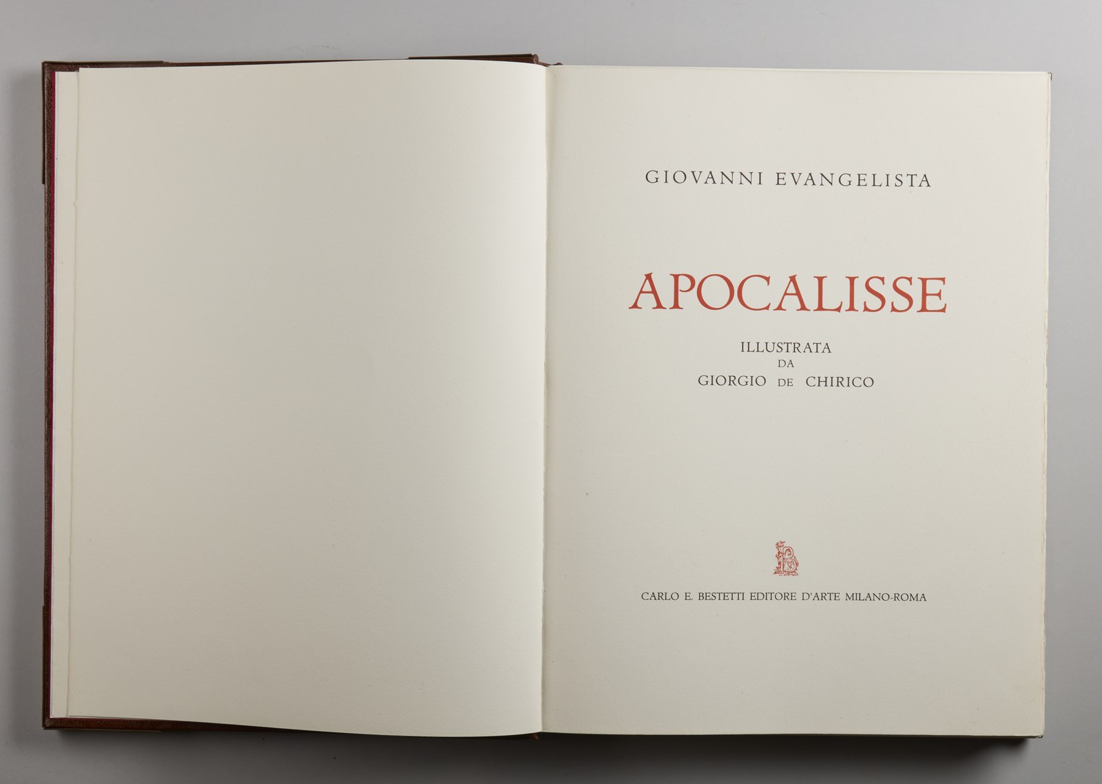 DE CHIRICO GIORGIO (1888 - 1978) L'apocalisse. Fotolitografia. Cm 42,00 x 54,00 x 8,00. 495/1125. Tiratura a matita e firma a penna sul colophon. Di questo volume stampato per conto di Carlo E. Bestetti Editore d'arte, sono stati tirati 1125 esemplari numerati e firmati dall'artista, di cui: 999 esemplari numerati da 100 a 1099; 99 esemplari numerati da 1 a 99 accompagnati da un'acquaforte numerata da 1/99 a 99/99 e firmata dall'artista; 15 esemplari fuori commercio numerati da I a XV e accompagnati da un'acquaforte numerata da I/XV a XV/XV e firmata dall'artista; 7 esemplari ad personam; 5 esemplari su carta speciale contraddistinti dalle lettere A/B/C/D/E accompagnati da un'acquaforte firmata dall'artista. Le tavole sono state stampate da Isabella Far. Questa edizione dell'Apocalisse è illustrata con riproduzioni fotolitogrfiche di 22 disegniu di G. De Chirico. Venti tavole riproducono i disegni eseguiti da Giorgio De Chirico per la prima edizione dell'Apocalisse del 1941. Due tavole riproducono disegni espressamente realizzati dall'artista, nel 1977, per la presente edizione. Difetti.