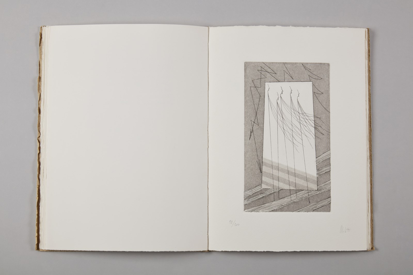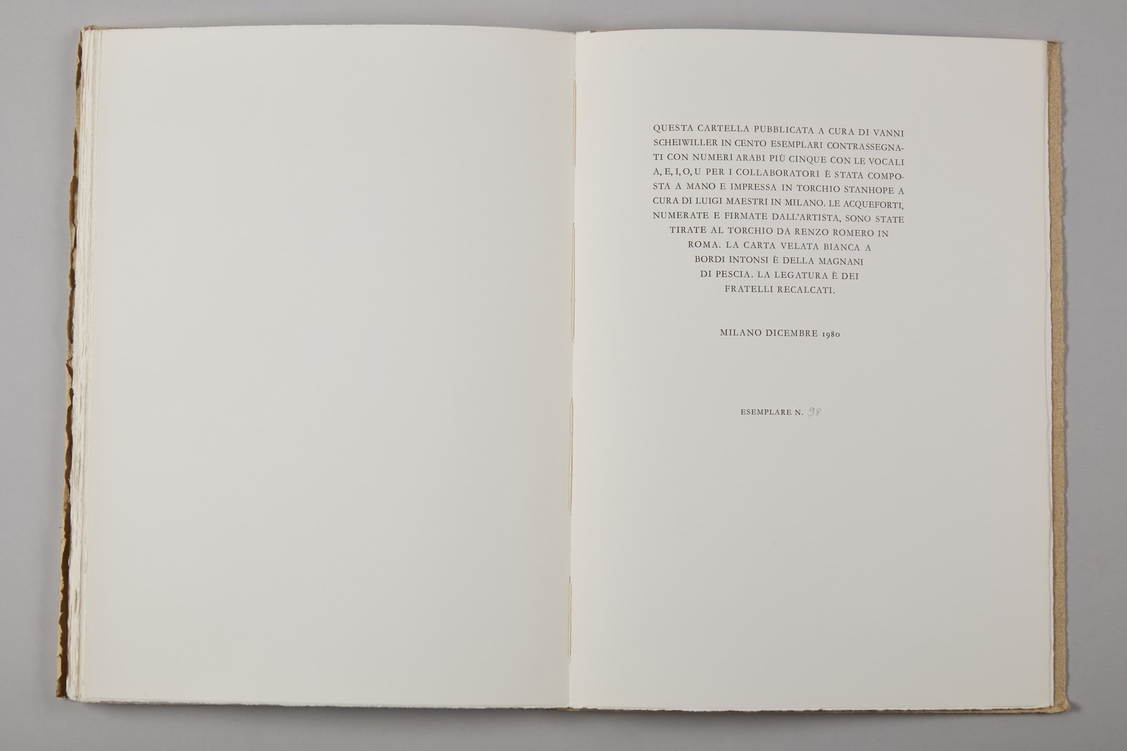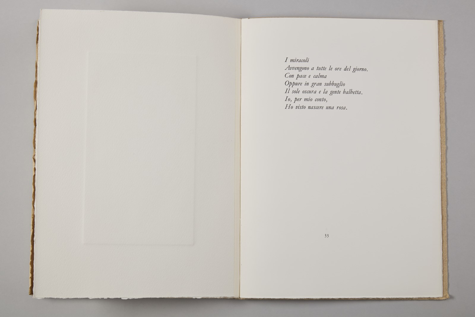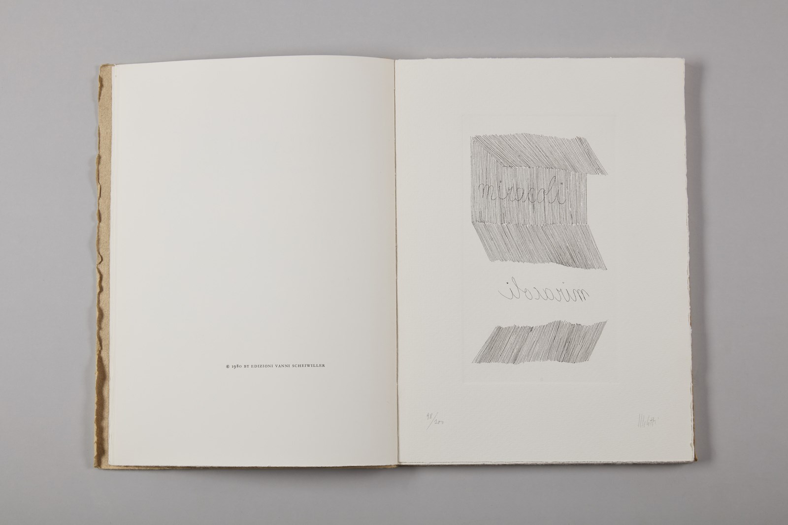 MELOTTI FAUSTO (1901 - 1986) Miracoli. 1980. Libro d'artista. Cm 26,00 x 35,00. 98/100. Cartella composta da quattordici poesie e sei acqueforti. Tiratura e firma in basso a matita su ogni acquaforte. Dimensione lastre: 23,5x13,5cm. Edizioni Vanni Scheiwiller. Edizione totale: 100 esemplari contrassegnati in numeri arabi, 5 con le vocali (composta a mano e impressa in torchio Stanhope). Le acqueforti sono state tirate al torchio da Renzo Romero in Roma. Carta velata bianca a bordi intonsi, Magnani, Pescia. Legatura dei fratelli Recalcati. Lievi difetti.