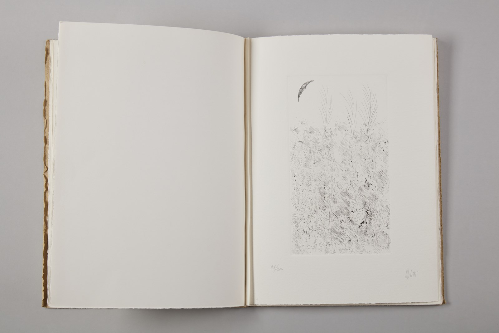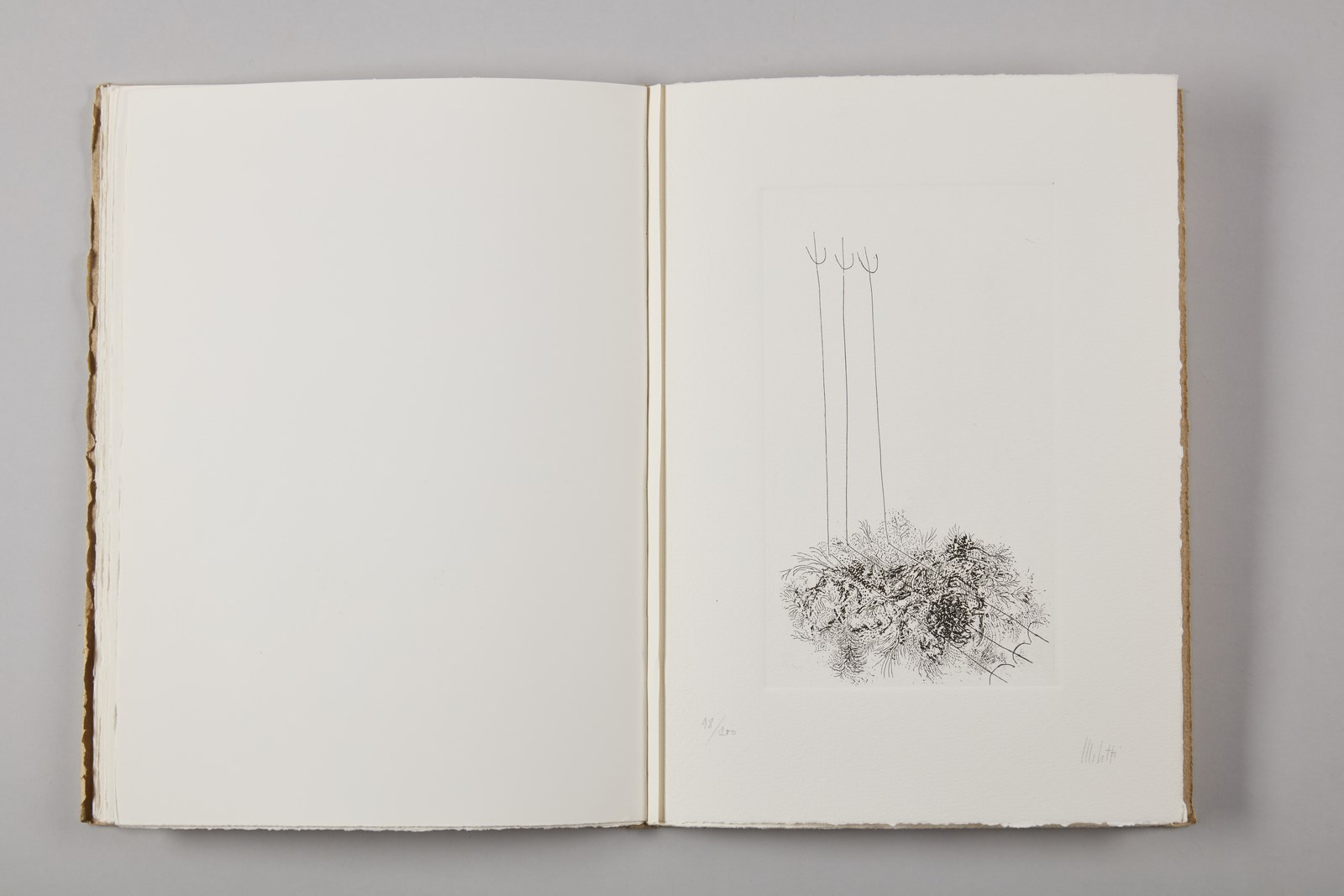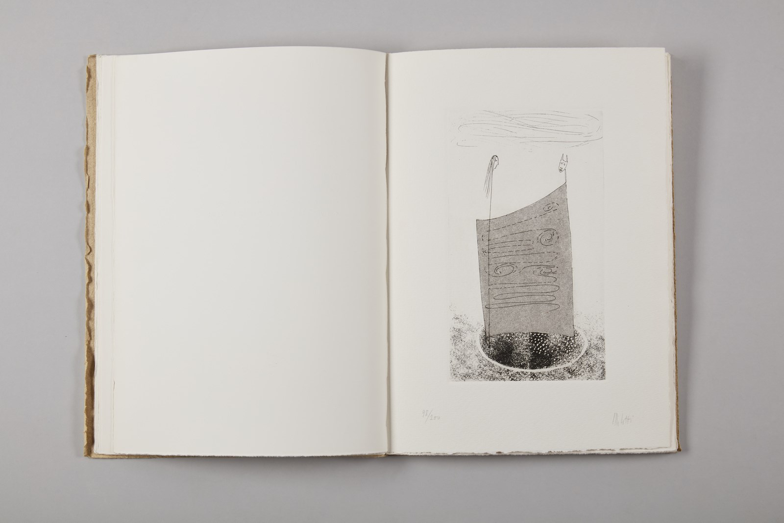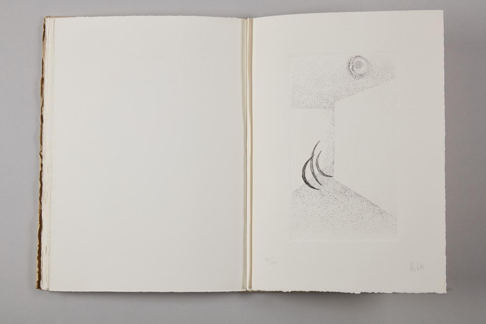 MELOTTI FAUSTO (1901 - 1986) Miracoli. 1980. Libro d'artista. Cm 26,00 x 35,00. 98/100. Cartella composta da quattordici poesie e sei acqueforti. Tiratura e firma in basso a matita su ogni acquaforte. Dimensione lastre: 23,5x13,5cm. Edizioni Vanni Scheiwiller. Edizione totale: 100 esemplari contrassegnati in numeri arabi, 5 con le vocali (composta a mano e impressa in torchio Stanhope). Le acqueforti sono state tirate al torchio da Renzo Romero in Roma. Carta velata bianca a bordi intonsi, Magnani, Pescia. Legatura dei fratelli Recalcati. Lievi difetti.