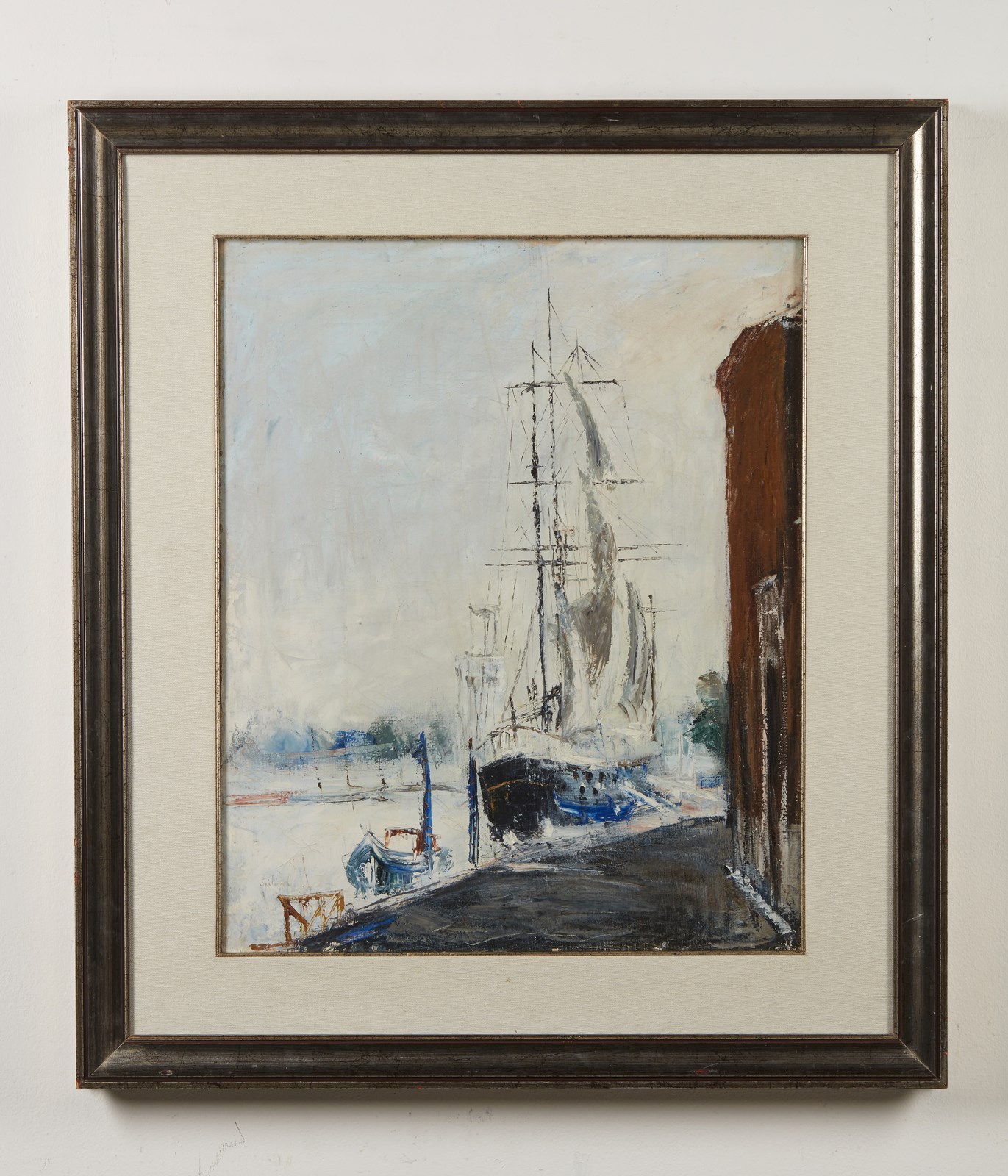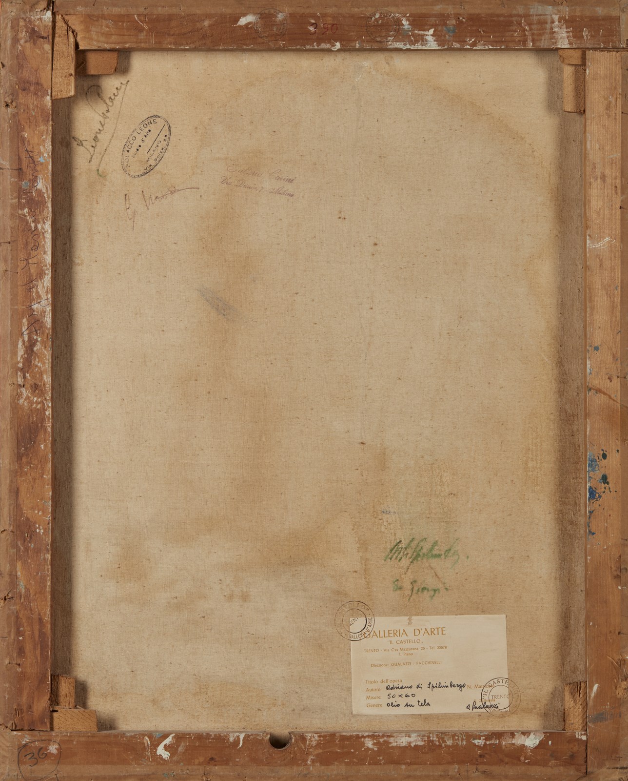SPILIMBERGO ADRIANO (1908 - 1975) Senza titolo. Olio su tela . Cm 50,00 x 60,00. Al retro firma, cartiglio descrittivo Galleria d'Arte Il Castello, Trento e timbro Studio d'Arte Polacco Leone, Milano. Difetti. . Cornice presente