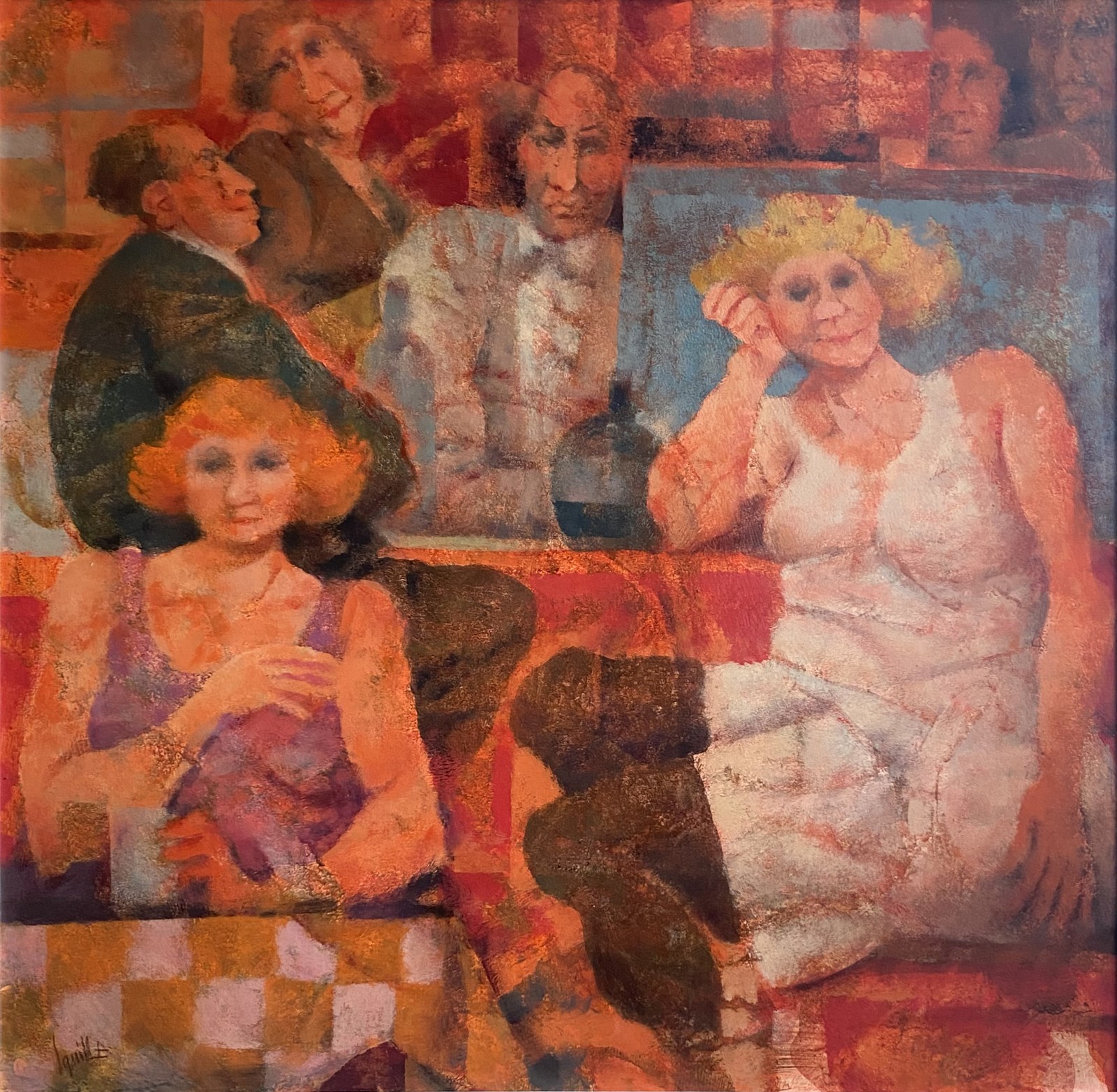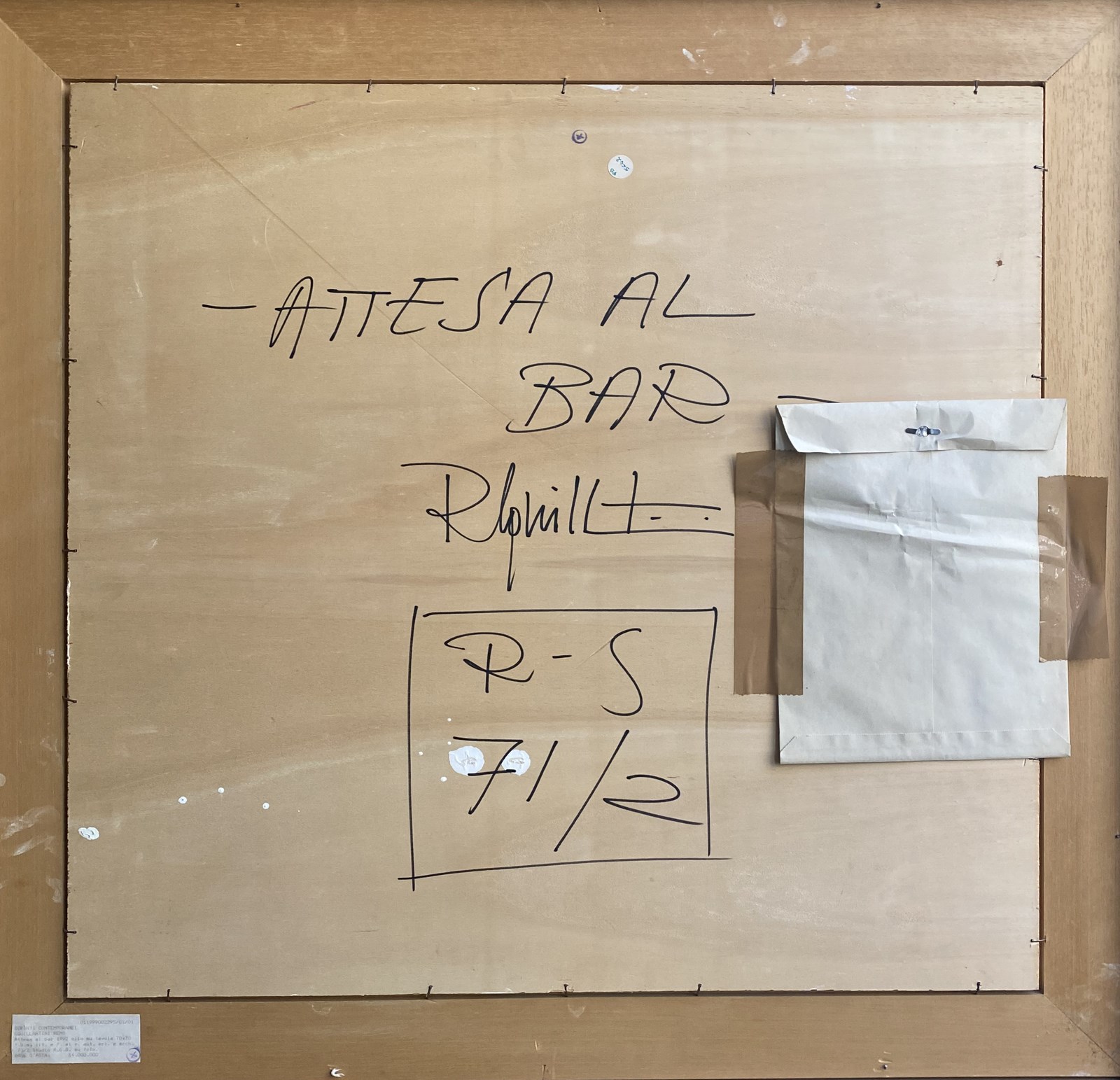 SQUILLANTINI REMO (1920 - 1996) Attesa al bar. 1992. Olio su tavola. Cm 70,00 x 70,00. Firma in basso a sinistra. Al retro titolo e firma. Opera archiviata presso l'Archivio Remo Squillantini - Giovanbattista Bianco, come da documentazione fotografica allegata all'opera riportante il relativo numero d'inventario e la firma dell'artista.