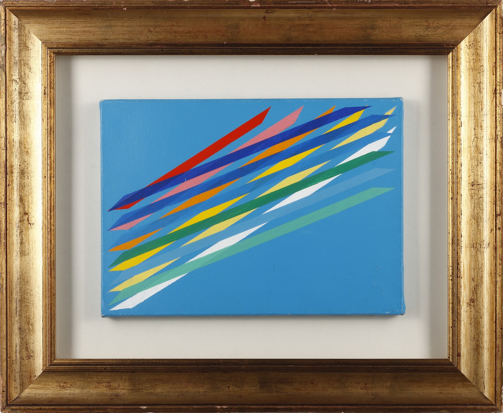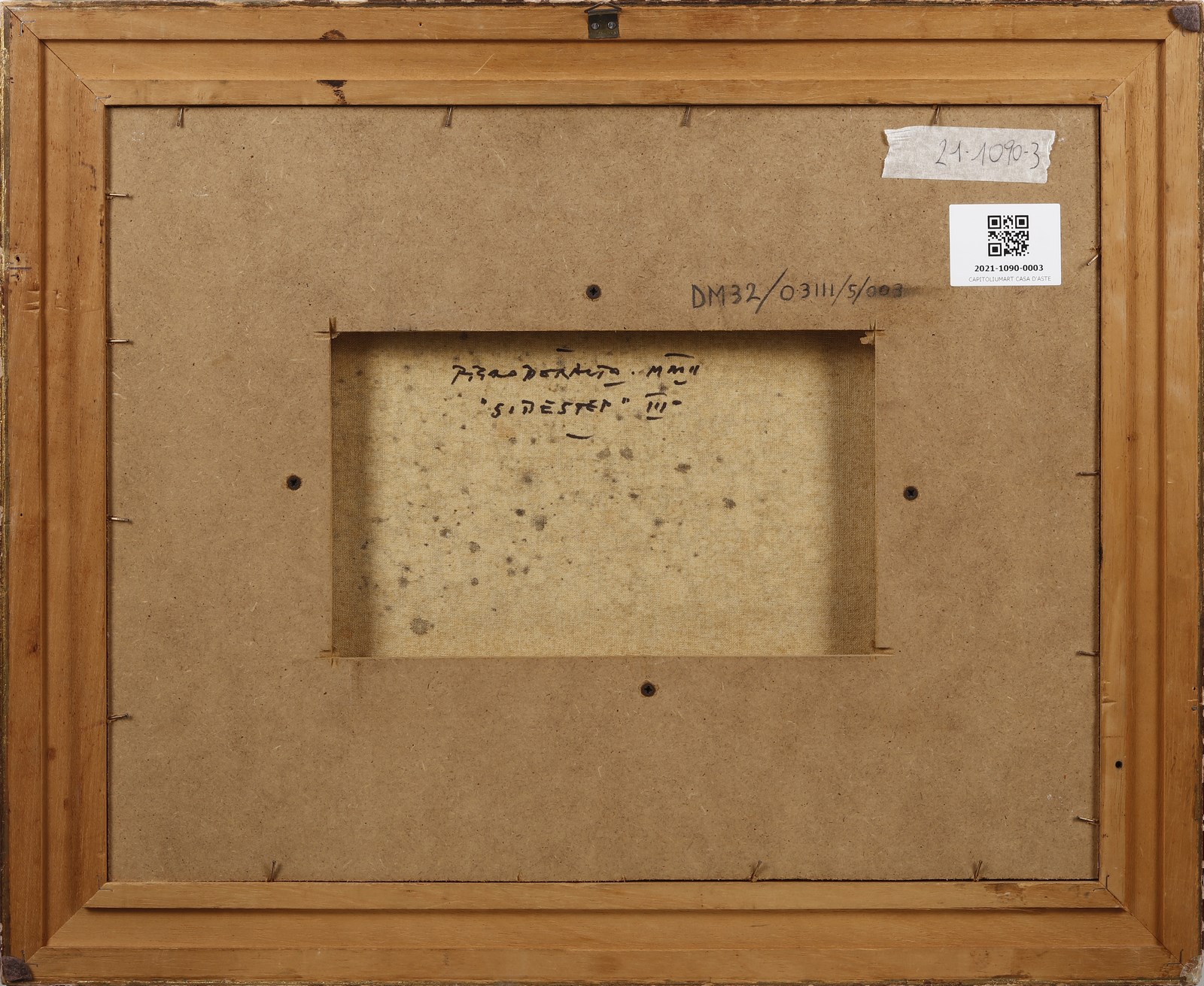 DORAZIO PIERO (1927 - 2005) Sidestep III. Olio su tela . Cm 35,00 x 25,00. Al retro titolo, firma e timbro dello Studio Dorazio. Opera registrata presso l'Archivio Piero Dorazio, Milano, come da certificato su fotografia in data 17 Febbraio 2022. Opera archiviata presso lo Studio Piero Dorazio come da documentazione fotografica allegata all'opera riportante il relativo numero d'inventario e la firma dell'artista. Difetti. Cornice presente