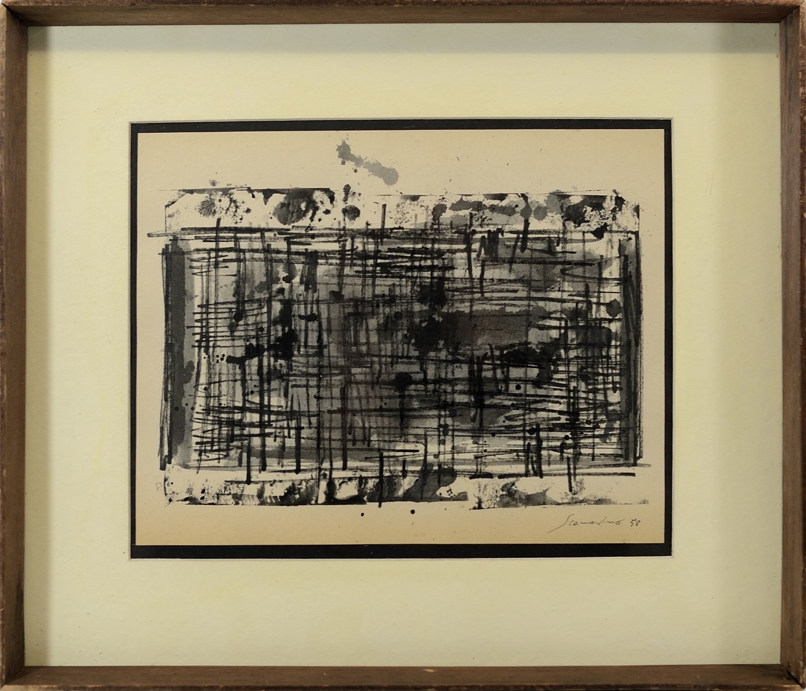 SCANAVINO EMILIO (1922 - 1986) Senza titolo. 1958. Inchiostro su carta. Cm 28,50 x 22,20. Firma e data in basso a destra. Provenienza: Galleria Regis, Finale Ligure; Collezione privata, Torino. Si ringrazia l'Archivio Scanavino, Milano, per aver confermato l'autenticità dell'opera. Cornice presente