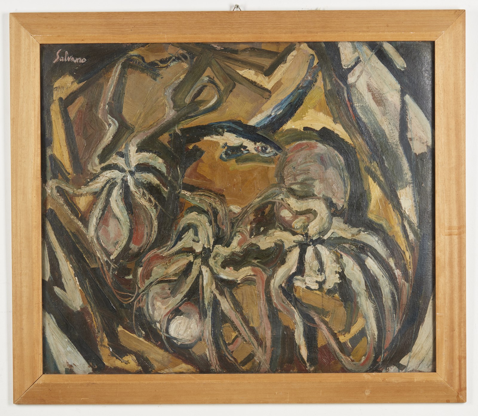 GALVANO ALBINO (1907 - 1991) Pesci e polpi. 1932. Olio su cartone. Cm 70,00 x 60,00. Firma in alto a sinistra. Al retro firma e data. Pubblicato su catalogo mostra "Carol Rama- Albino Galvano" giugno 1993. Galleria Over Studio Torino. . Cornice presente