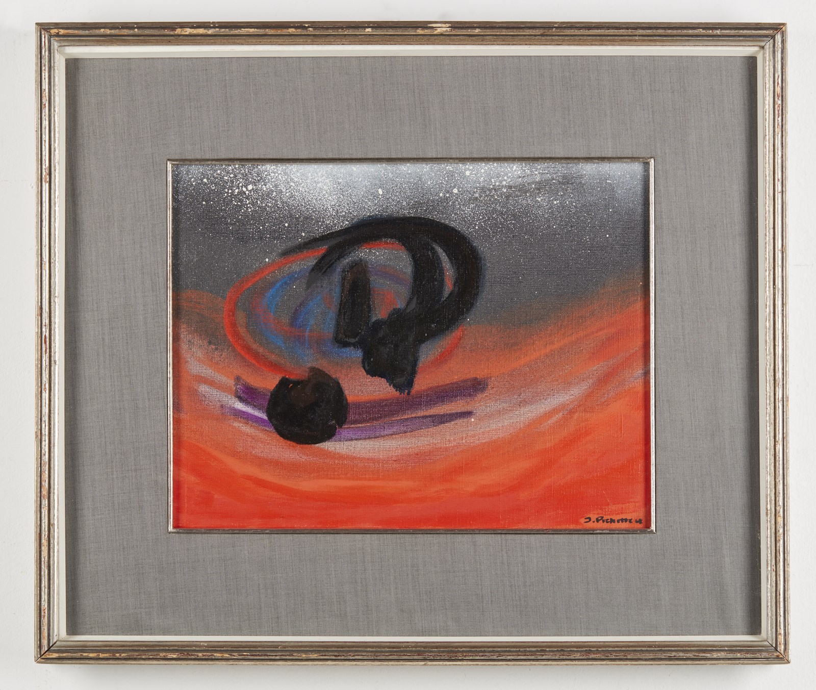PICCHETTE JAMES (1920 - 1996) Les signes de l'espace. 1968. Olio su tela . Cm 35,00 x 27,00. Firma e anno in basso a destra. Al retro titolo, firma, anno e timbro Galleria Cavour, Milano. Certificato di provenienza Aste Boetto, Genova. Lievi difetti. . Cornice presente