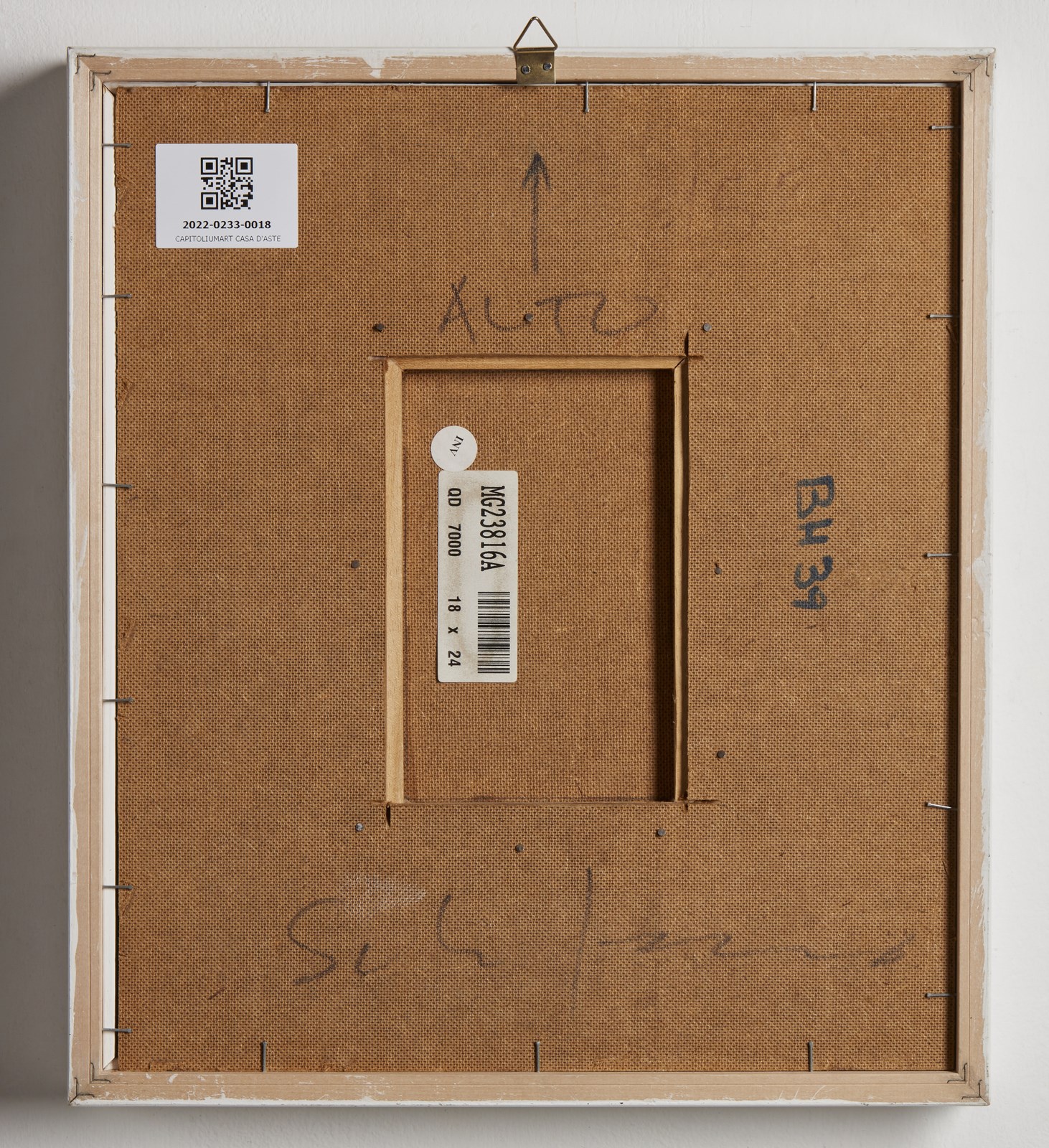 SCHIFANO MARIO (1934 - 1998) Senza titolo. Tecnica mista su carta. Cm 18,00 x 24,00. Firma al retro. Opera archiviata presso la Fondazione M.S. Multistudio, Milano, come da documentazione fotografica allegata all'opera riportante il relativo numero d'inventario ( duplicato). Seconda metà degli anni '70. Pubblicazione: Mario Schifano, opere su tela 1956 -1982, Tomo I, pag. 283, tav. sm70/233. Lievi difetti. . Cornice presente