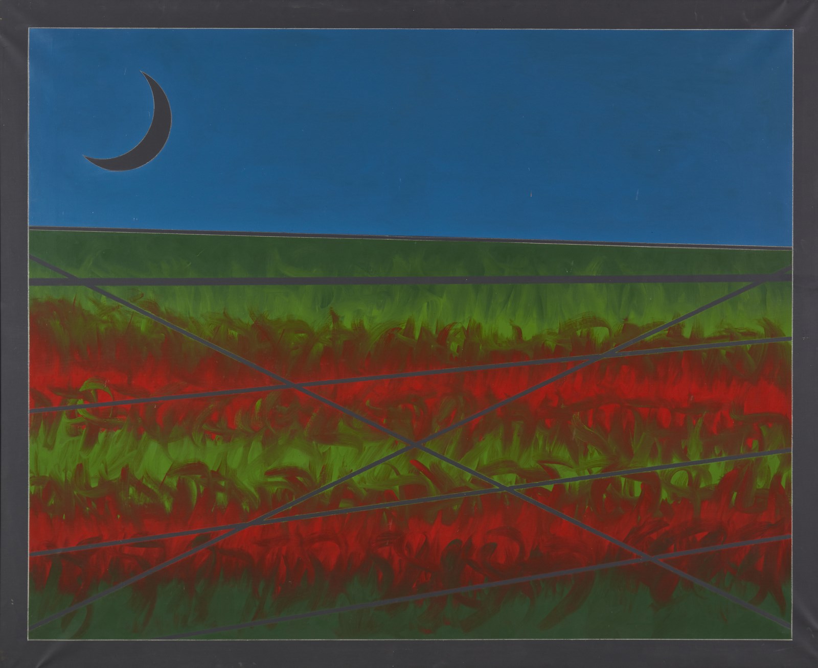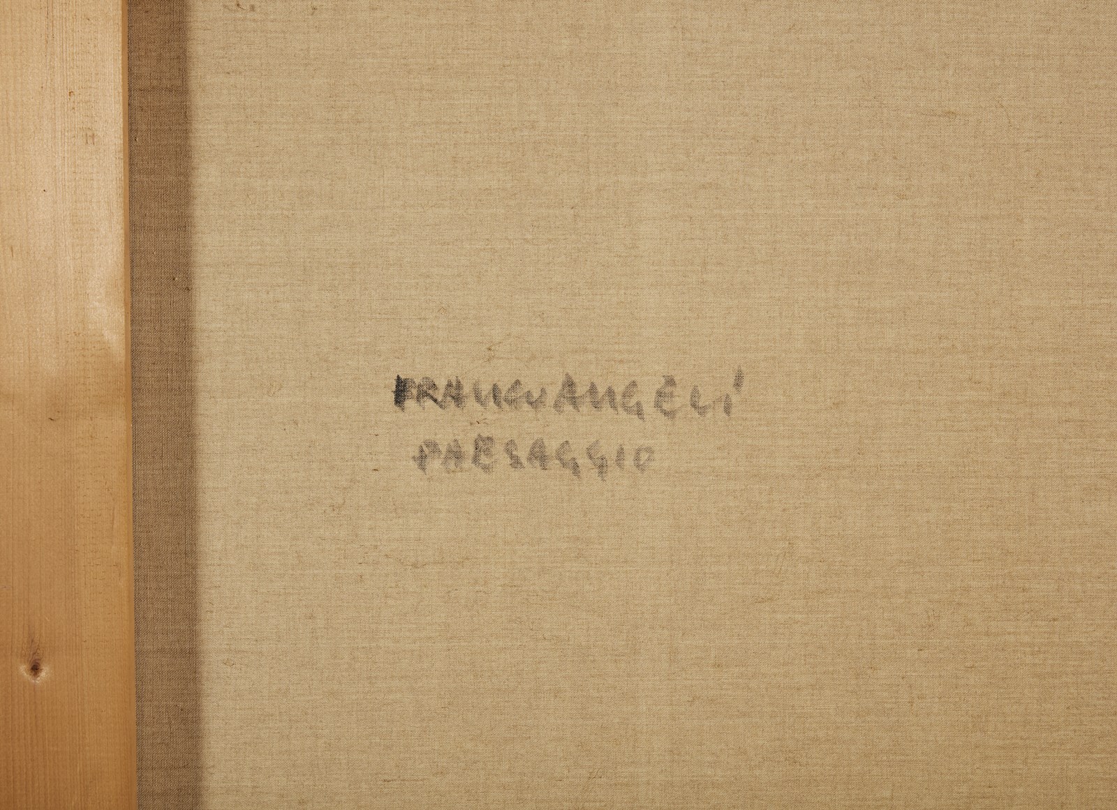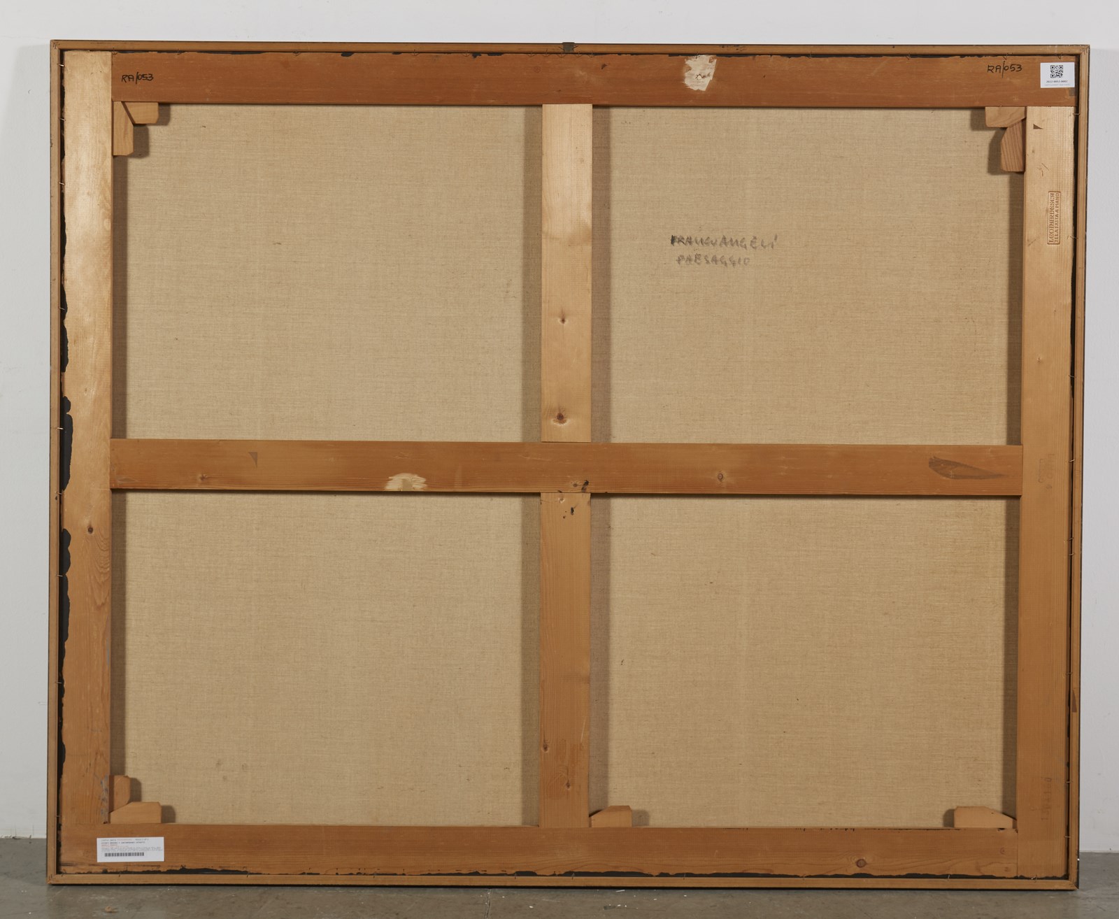 ANGELI FRANCO (1935 - 1988) Paesaggio. Tecnica mista su tela. Cm 160,00 x 130,00. Al retro firma e anno. Opera archiviata presso l'Archivio Franco Angeli, Roma, come da documentazione fotografica allegata all'opera riportante il relativo numero d'inventario. Anni'80. Cornice presente