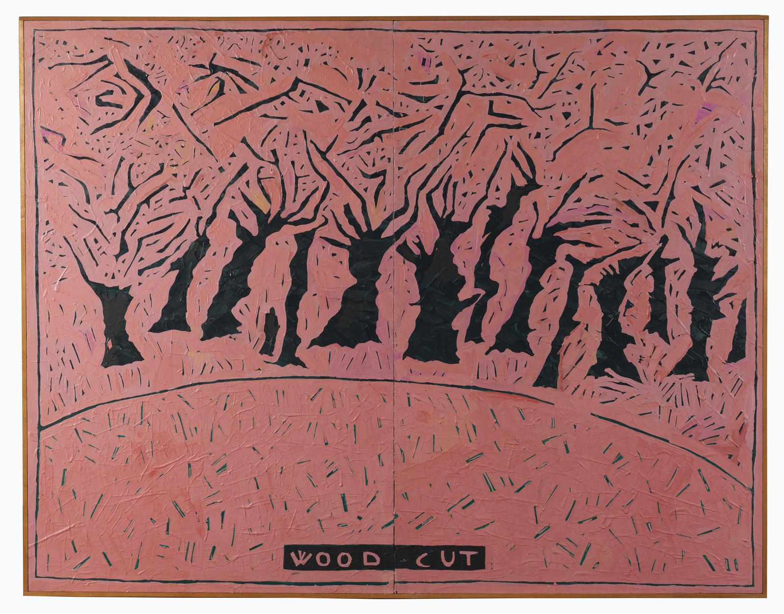 MONDINO ALDO (1938 - 2005) Wood cut. 1981. Acrilico su tela. Cm 200,00 x 140,00. Titolo in basso al centro. Al retro titolo, firma e anno. Autentica dell'artista su fotografia.