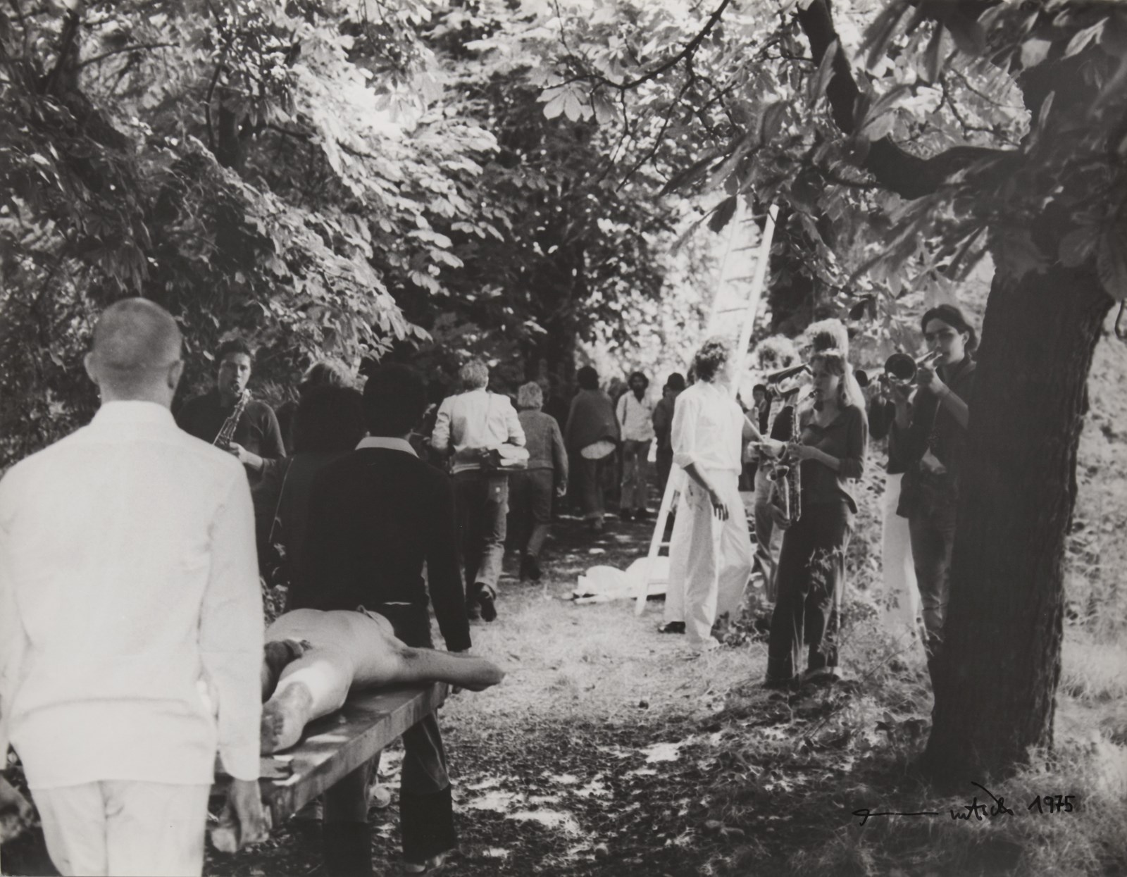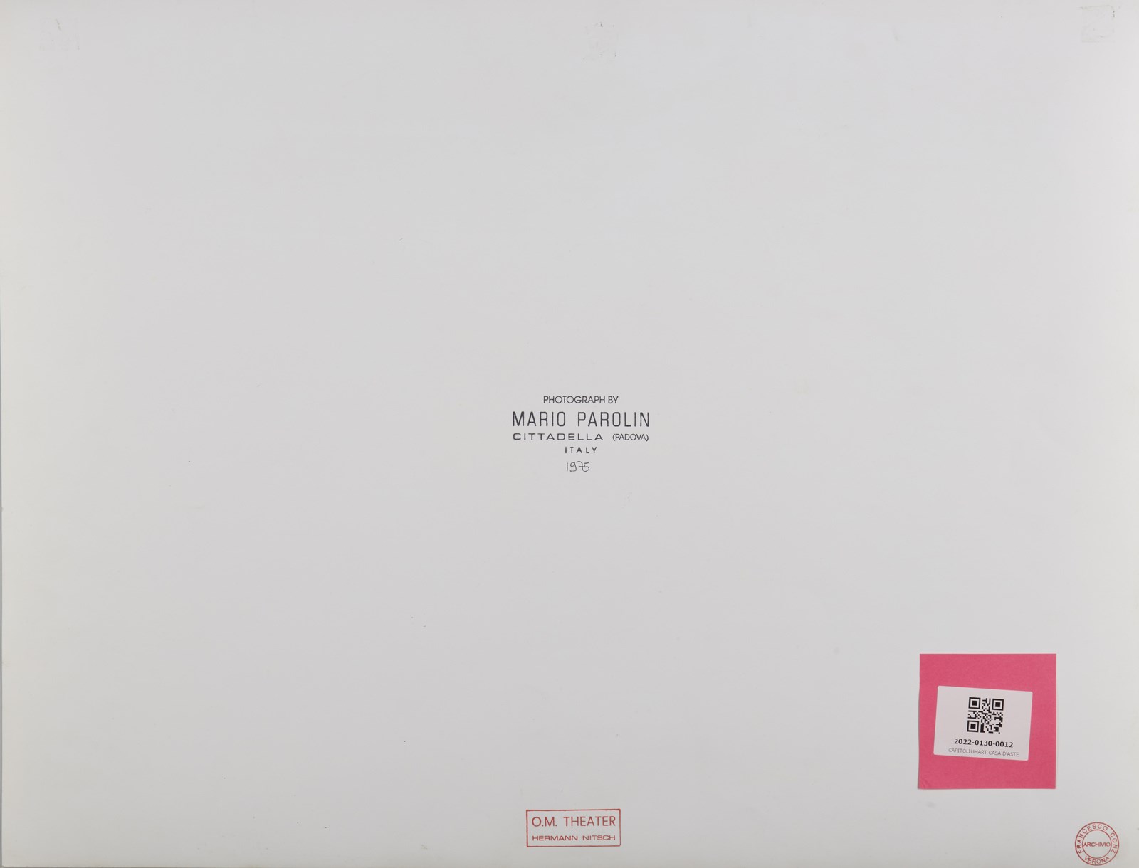 NITSCH HERMANN (n. 1938) Aktion n,.50 Kopiertnim jahare. 1975. Fotografia. Cm 50,00 x 60,00. Firma e anno in basso a destra a pennarello. Al retro timbri O.M. Theatre Hermann Nitsch, credito di Mario Parolin e Francesco Conz, Verona. Lievi difetti.