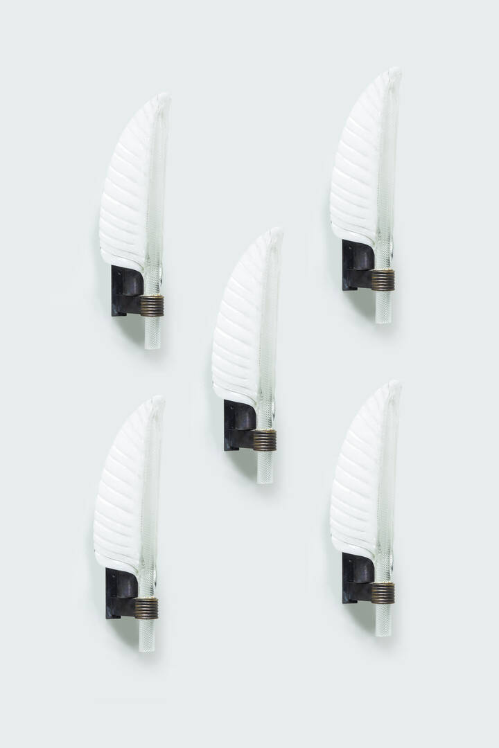 Precedente Lotto 8 Successivo Sant’Agostino - Corso Tassoni 56, 10144 Torino Asta 200 Illuminazione Sessione unica venerdì 8 aprile 2022 ore 16:00 (UTC +01:00) VENINI VENINICinque appliques in vetro di Murano a forma di foglia.Anni '50cm 11x40