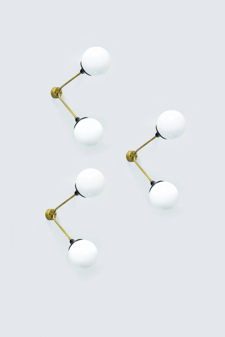 Tre appliques in ottone, diffusori in vetro opalino.