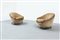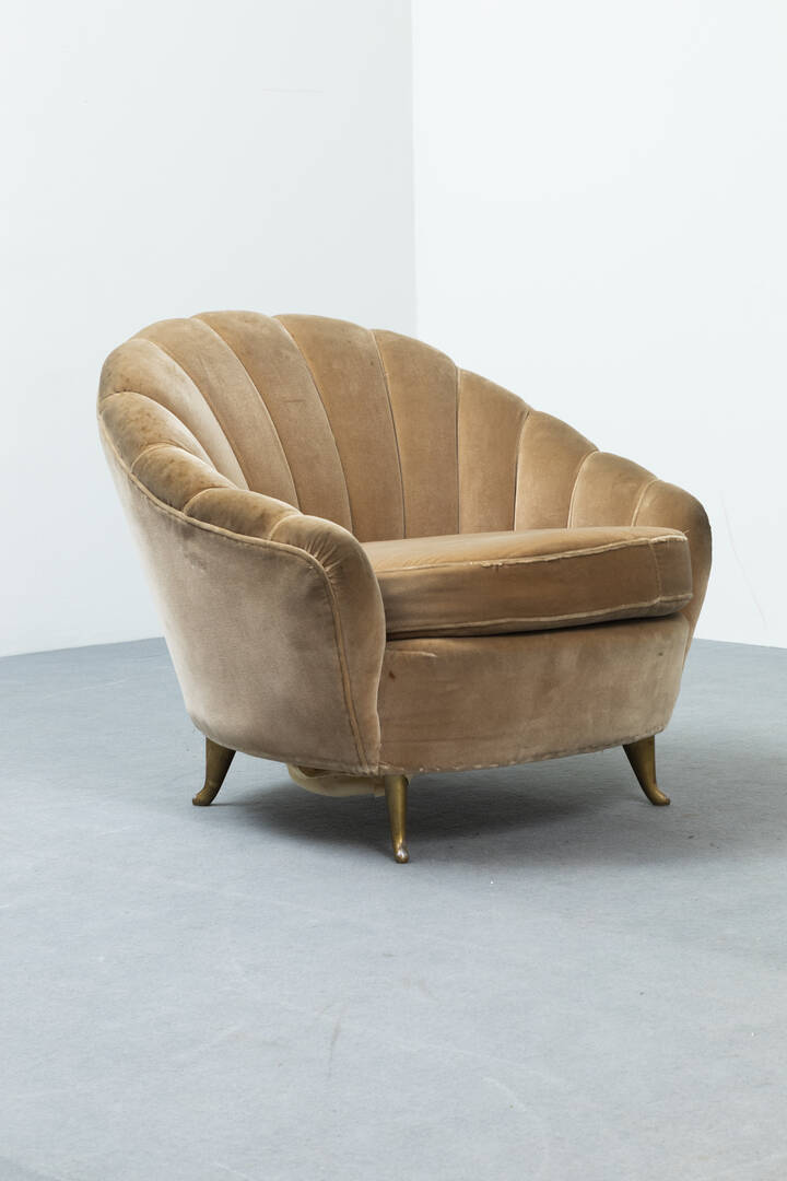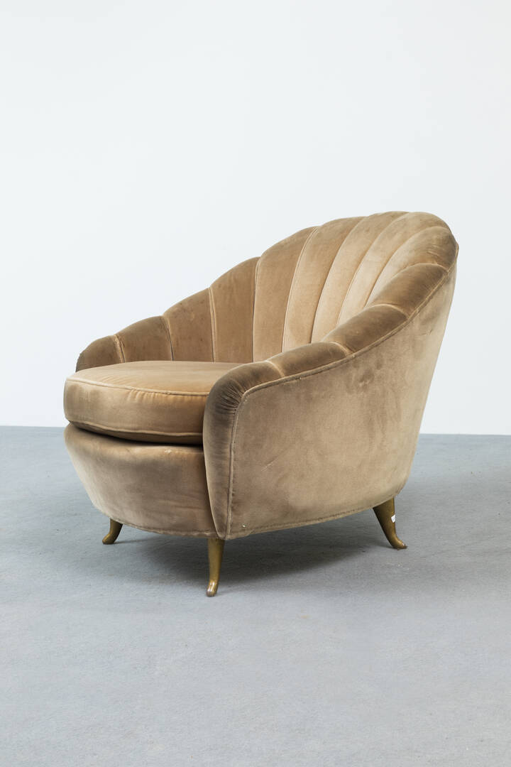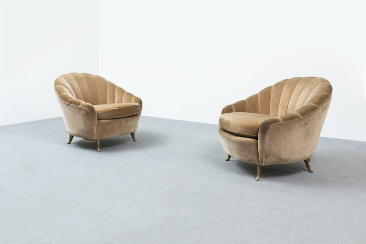 Coppia di poltrone con imbottitura rivestita in velluto, gambe in ottone.