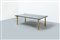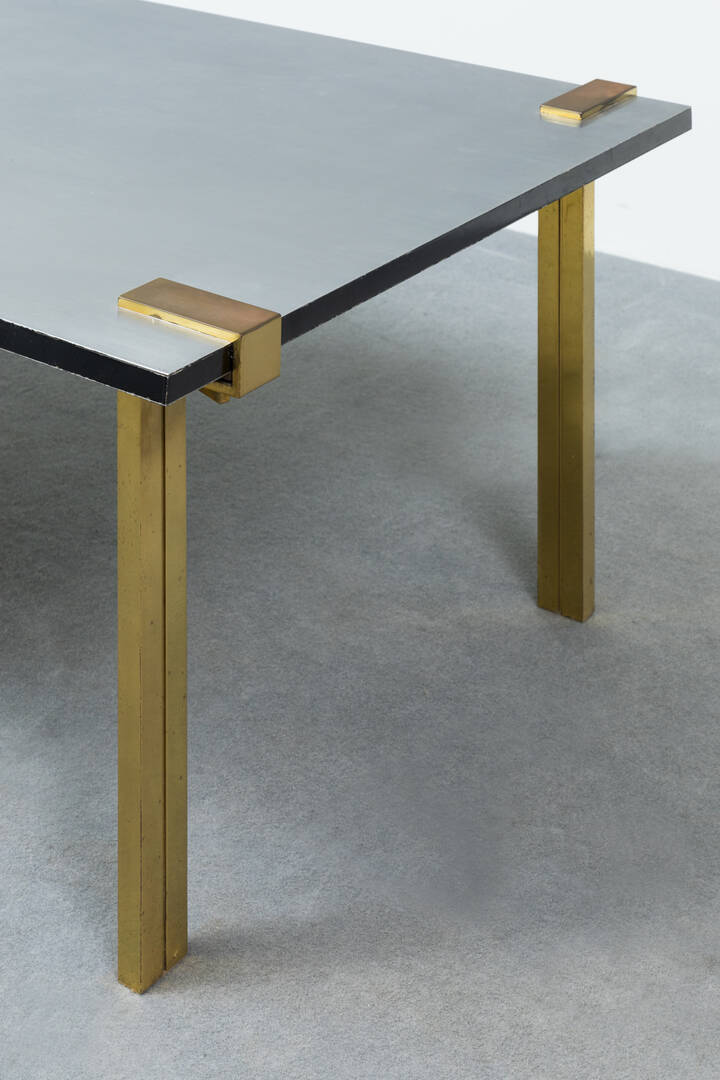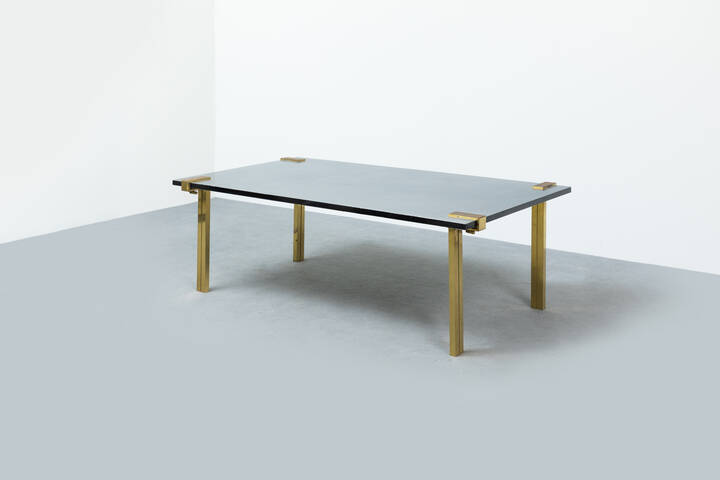 Tavolo basso con struttura in ottone, piano in vetro fumé.