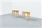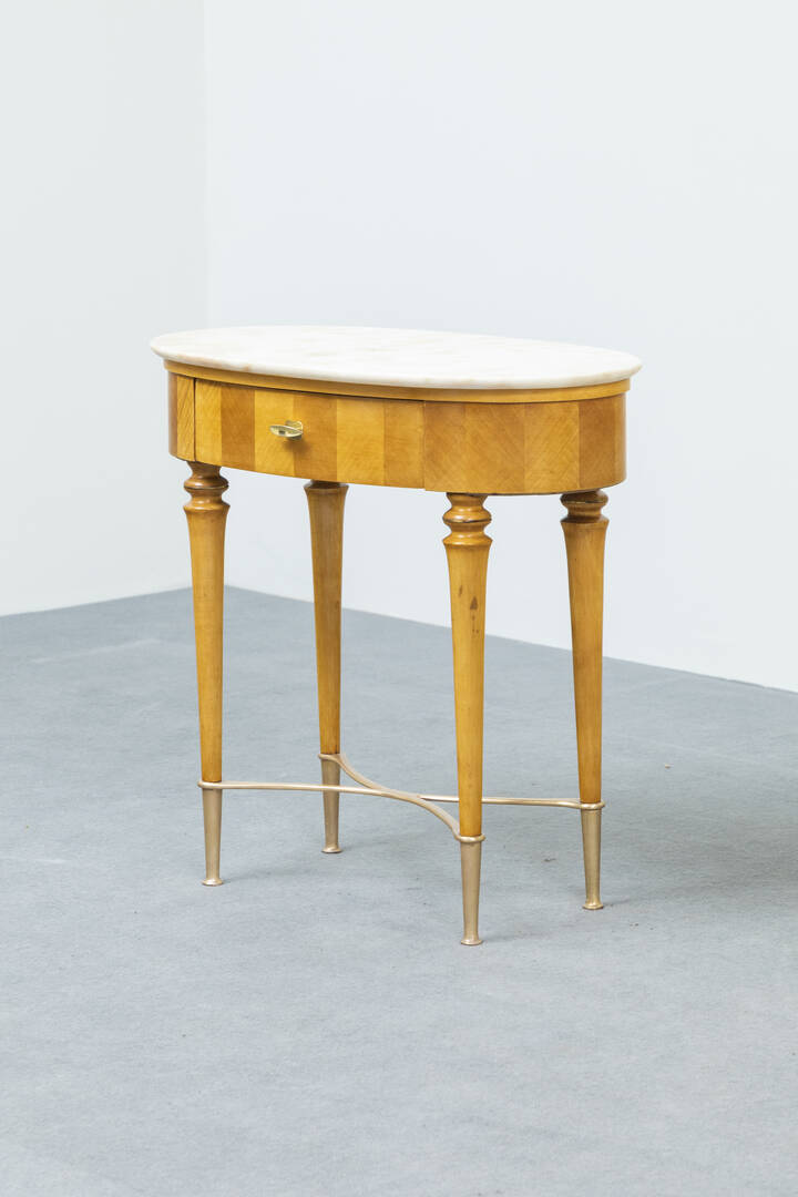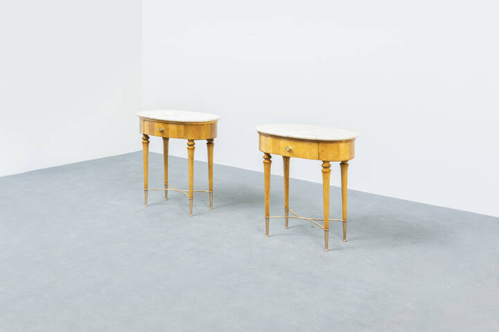 Coppia di comodini in legno chiaro, piano in marmo, particolari in ottone.
