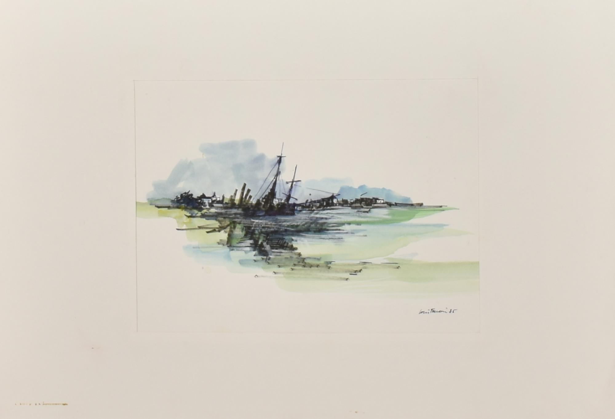 Loris Ferrari VEDUTA SU PORTO acquerello e china su carta, cm 21x28 firma e...