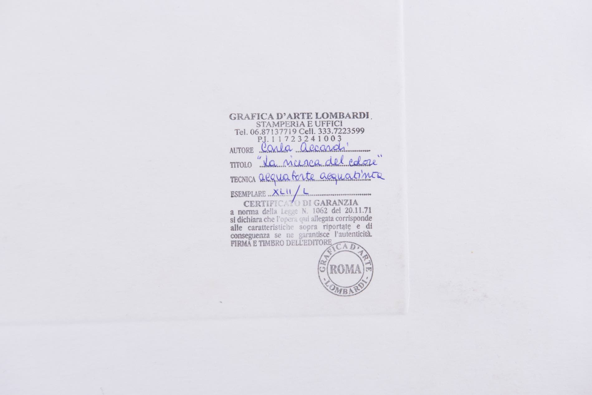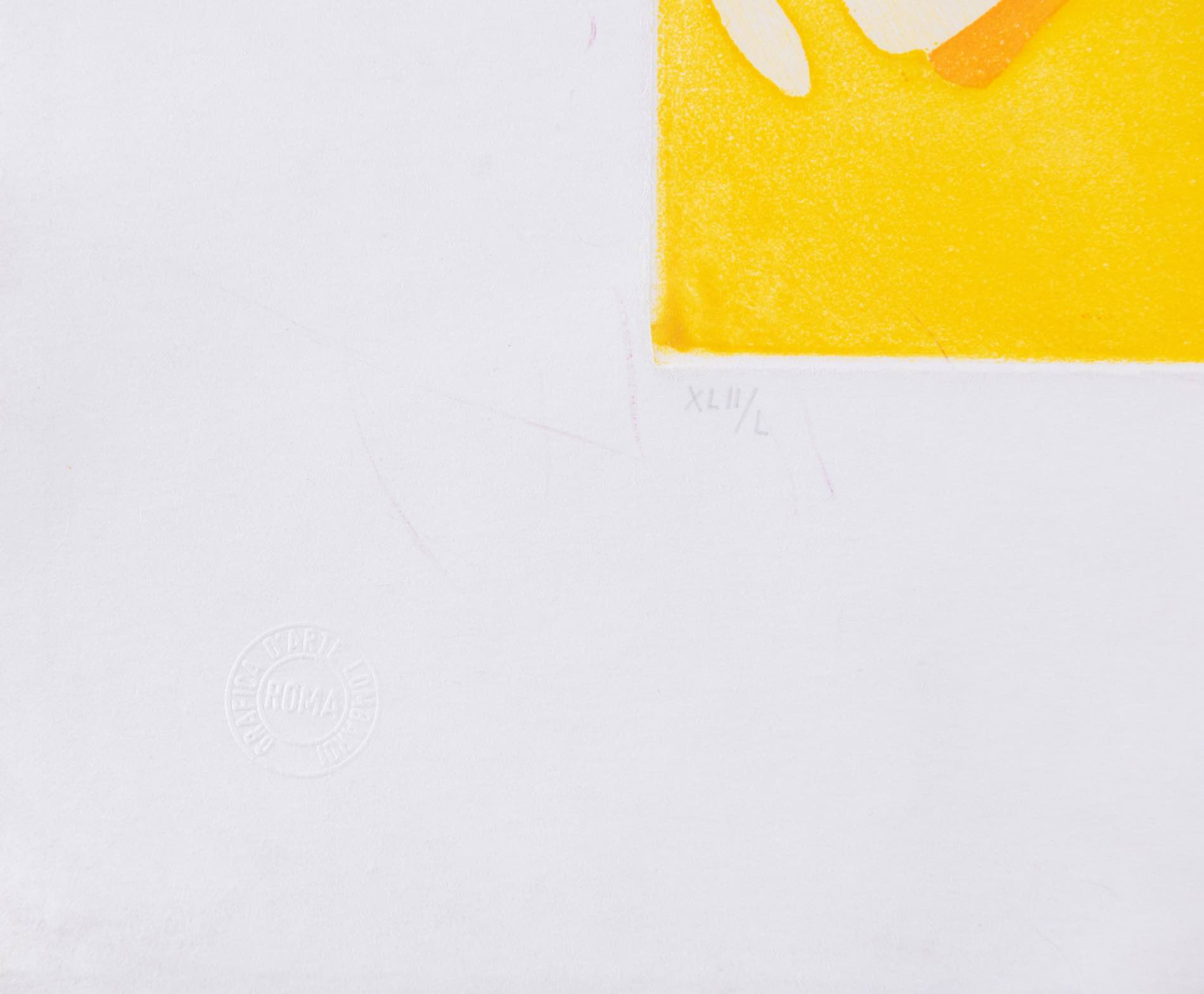 Carla Accardi (Trapani 1924 - Roma 2014), “La ricerca del colore”. Acquaforte acquatinta a colori su carta, firmata in basso a destra Accardi, esemplare in basso a sinistra XLII/L, reca timbro a secco Grafica d'Arte Lombardi - Roma, Lastra H cm 51.5x78 - Foglio H cm 70x100 (lievi usure) - Al retro reca timbro per certificato di garanzia di Grafica d'Arte Lombardi - Roma con autore, titolo, tecnica e esemplare.