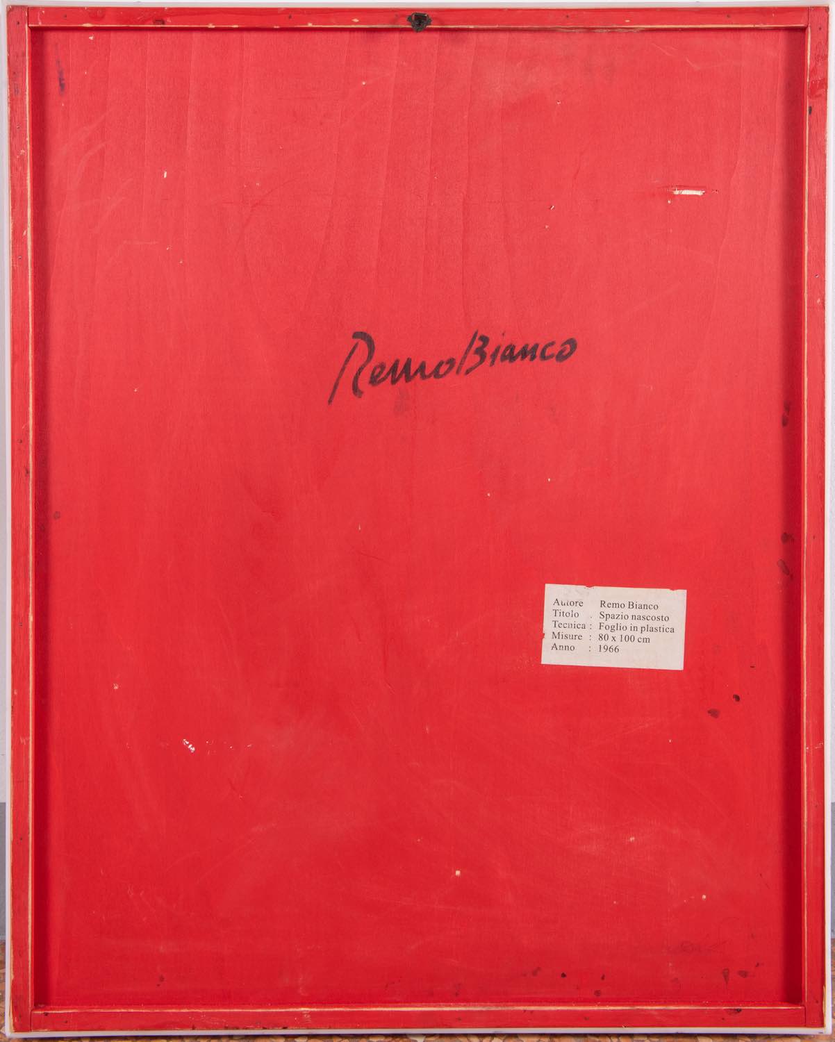 Remo Bianco (Milano 1922 - 1988), “Spazio nascosto”, 1966. Foglio in plexiglas sagomato su tavola, al retro reca firma ed etichetta, H cm 100x80 - Opera accompagnata da certificato di autenticità su fotografia a firma della sorella Lydia Bianchi con tecnica, dimensioni, titolo e data “Foglio in plexiglas/sagomato 80x100/Spazio nascosto 1966”.