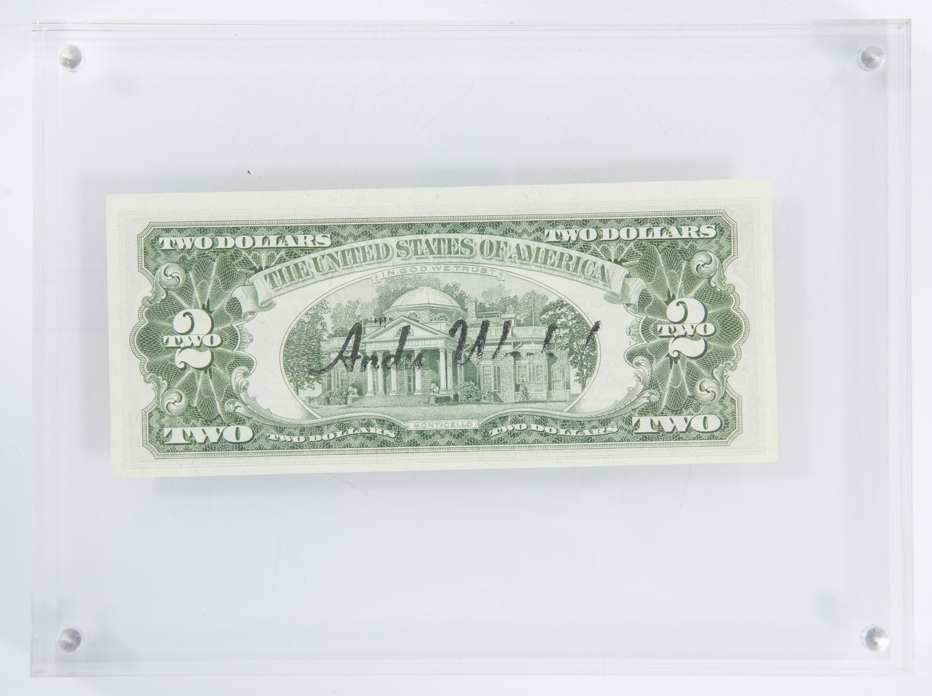 Andy Warhol, “2 dollars (Thomas Jefferson)”, 1963. Pennarello su banconota, firmata sul fronte Andy Warhol, reca al retro timbro Andy Warhol, H cm 15.5x6.6 - entro plexiglas - Opera accompagnata da certificato di autenticità Galerie 32 - Nice con numero A14962528A, timbro e firma.