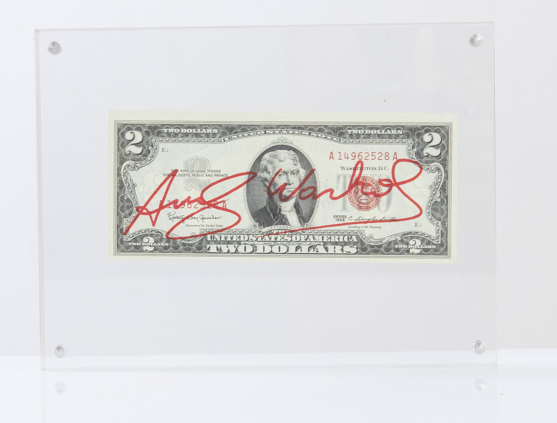 Lotto 62 | Andy Warhol, “2 dollars (Thomas Jefferson)”, 1963.Pennarello su banconota, firmata sul fronte